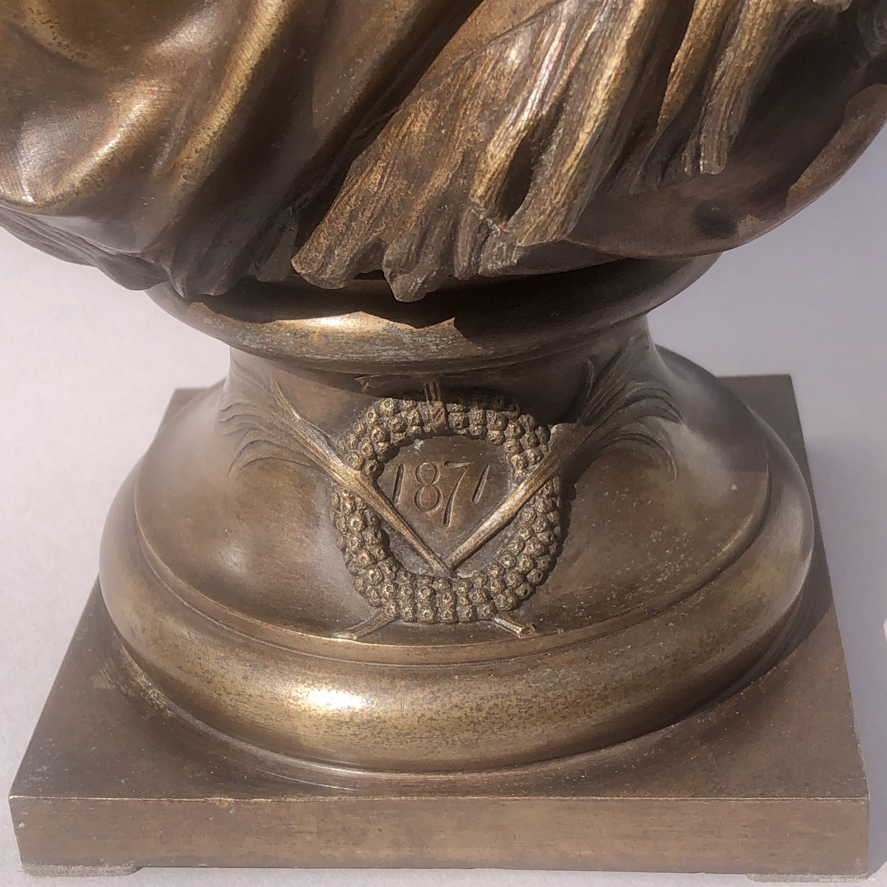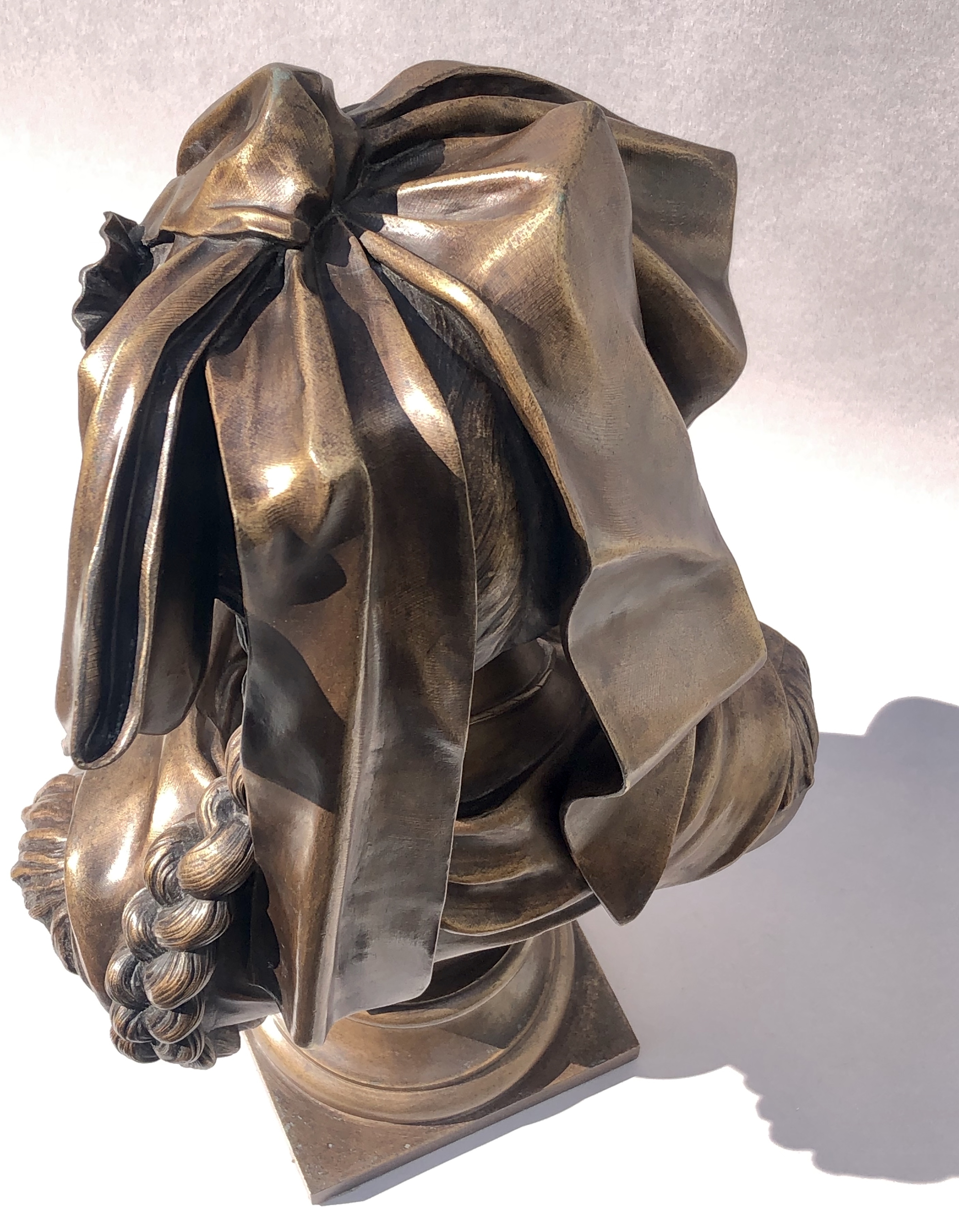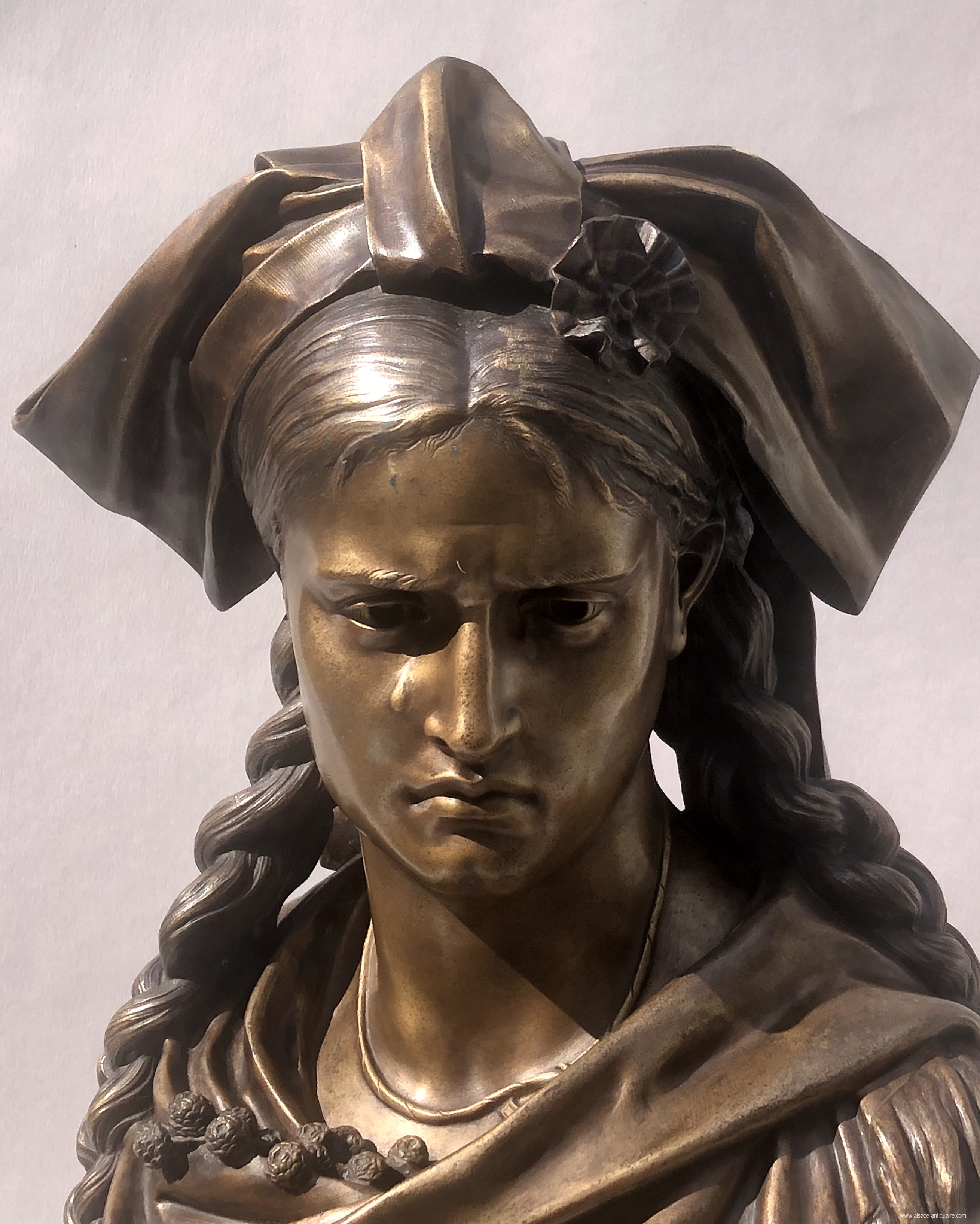 Jean-Louis Grégoire (1840-1890) French artist and sculptor, born in Paris, attended Jean Samson's courses at the Ecole des Beaux Arts in Paris and exhibited regularly in the Salons. Specialist in mythological scenes, he produced several patriotic subjects after the defeat of 1870. In this context, he sculpts, among other things, this superb bust of a young girl in tears symbolizing the suffering of the lost Alsace. This patriotism, widely developed during political debates by Gambetta, a fervent opponent of the abandonment of Alsace, is a theme taken up by many artists of the time. The painting signed by Jean Jacques Henner, "L’Alsace, elle attend", one of the most significant works of this period, was even included in all the history books made available to middle school students. Grégoire produced this work in 1871 and presented a marble version of his "Alsace" in the salon of 1873 and a bronze version in the salon of 1874. Henri d'Orleans, Duke of Aumale, donated in 1897 an identical bust in terracotta at the Condé Chateau Museum in Chantilly.