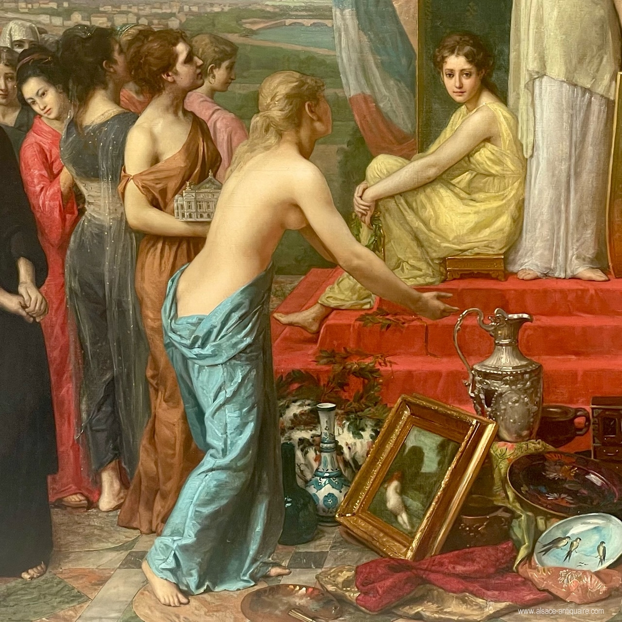The composition is wide-ranging, the nations participating in this international event are represented by women wearing traditional dress from their country, they surround the allegory of the City of Paris, a young woman presenting the city's coat of arms in front of a stele whose engraved pediment recalls the event. The work is centered on the apology of the Arts. Artists of Alsatian origin as well as the knowledge of our region are well represented here.