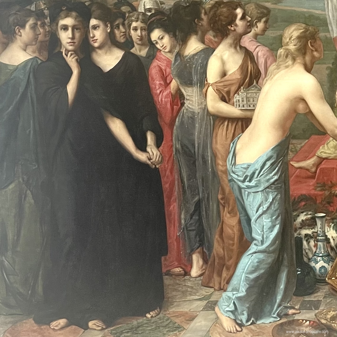 At the foot of the platform we recognize ceramics by Théodore Deck, born in Guebwiller, a well-known canvas by Jean Jacques Henner, Grand Prix de Rome, born in Berwiller in Sundgau, and the fabrics seem to come from Mulhouse factories. Remember that the Benner brothers started their careers in the Mulhouse textile industry by participating in the creation of patterns, especially floral, which may be an explanation for the presence of fabrics. Alongside this Alsatian group, other symbols complete the scene, in particular the David which would be the work of Antonin Mercier, perhaps a nod to the wish to take revenge on the German Empire following the defeat of 1870. The latter is also materialized by the presence, on the left of the painting, of two women in mourning dress, they materialize Alsace and Loraine whose partially concealed face evokes the part of this annexed region, more precisely the Moselle, here they are related to countries in their own right, lands lost in the context of the annexation of this part of French territory by Germany. The sad and lost gaze of these two women in the distance evokes a strong message sent to visitors or viewers, the hoped-for return to the motherland. This theme will also be widely disseminated by Jean-Jacques Henner's work "L'Alsace, elle attends". The Benners and Jean Jacques Henner were united by strong bonds of friendship, they made each other their portraits and Manny, Jean's son, benefited from the advice of the master and will be the life curator of the Jean Jacques Henner National Museum. Through this work, the two artists seem to take advantage of the event's audience to put Alsace back at the center of the debate on the reconquest of this lost territory and the value of the uprooted artists from these regions who chose to settle in Paris.