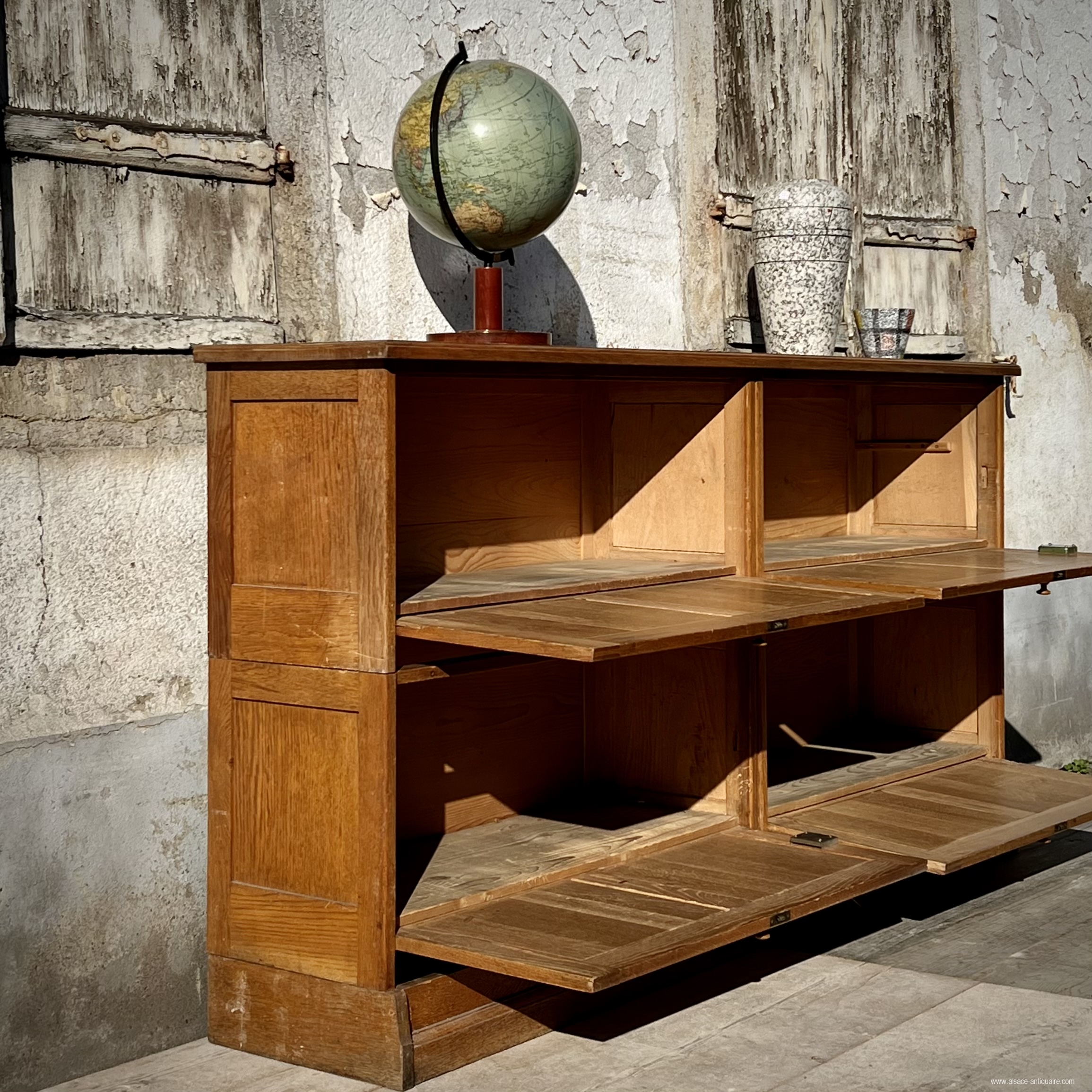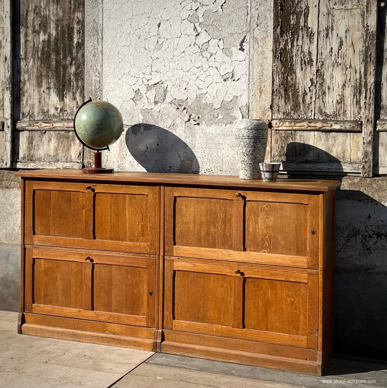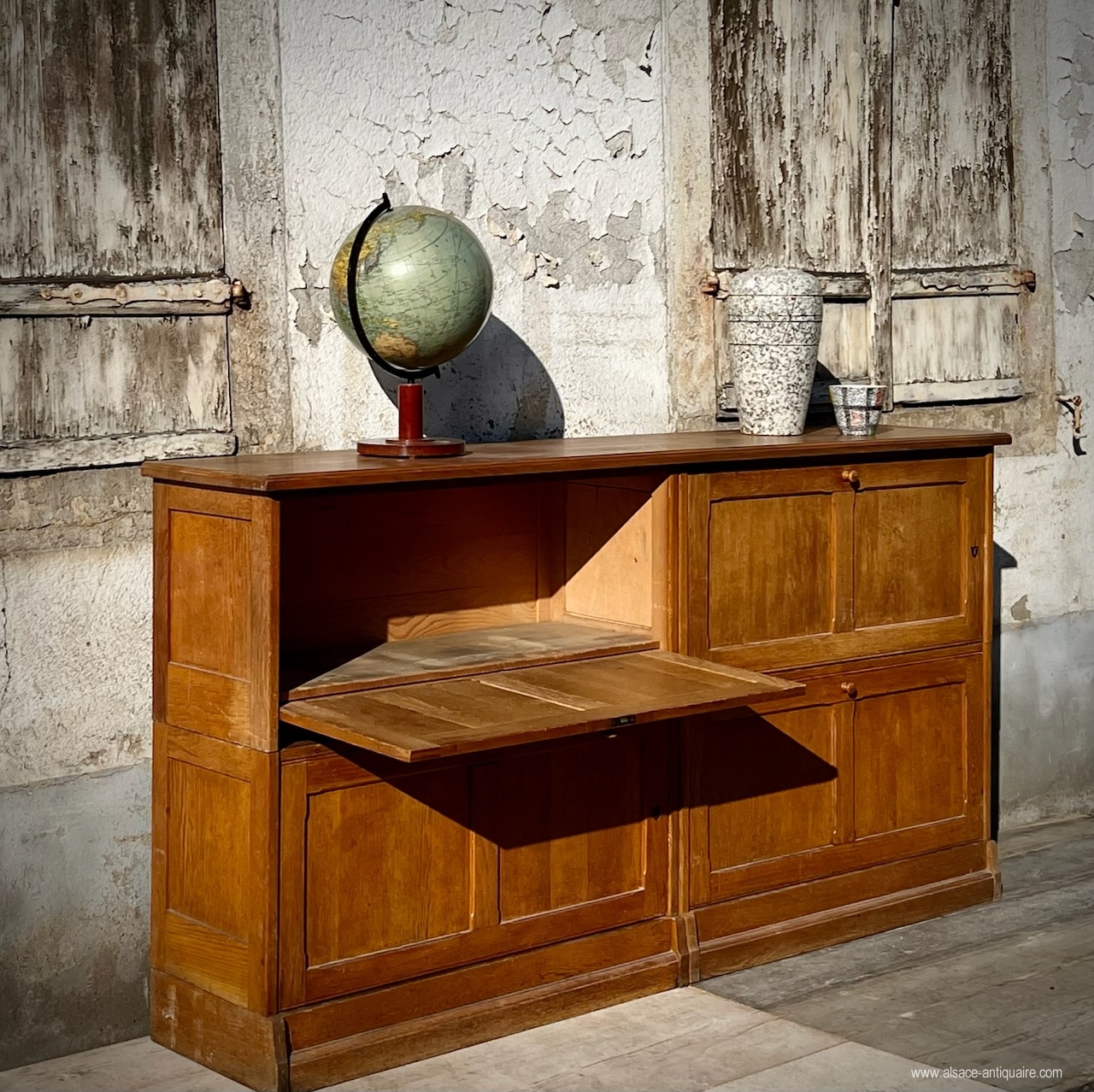 Very functional, and original in its design with its 4 drop-down doors, this piece of furniture at support height was made at the beginning of the 20th century to complete the office of the director of a major company in the fields of landscaping and landscaping. horticulture in our region. Made of blond oak, it has a beautiful old patina, the flaps reveal storage in which we can position books, binders, or crockery, because this piece of furniture can be diverted from its initial function to create a dining area. or a living room, it can also easily complement an industrial-style decor. The furniture is removable. Good condition with some traces of use. Dimensions length 216 cm x 112 cm x depth 41 cm. Decorative objects, world map and vases, are not included in the price and may be the subject of a specific offer.