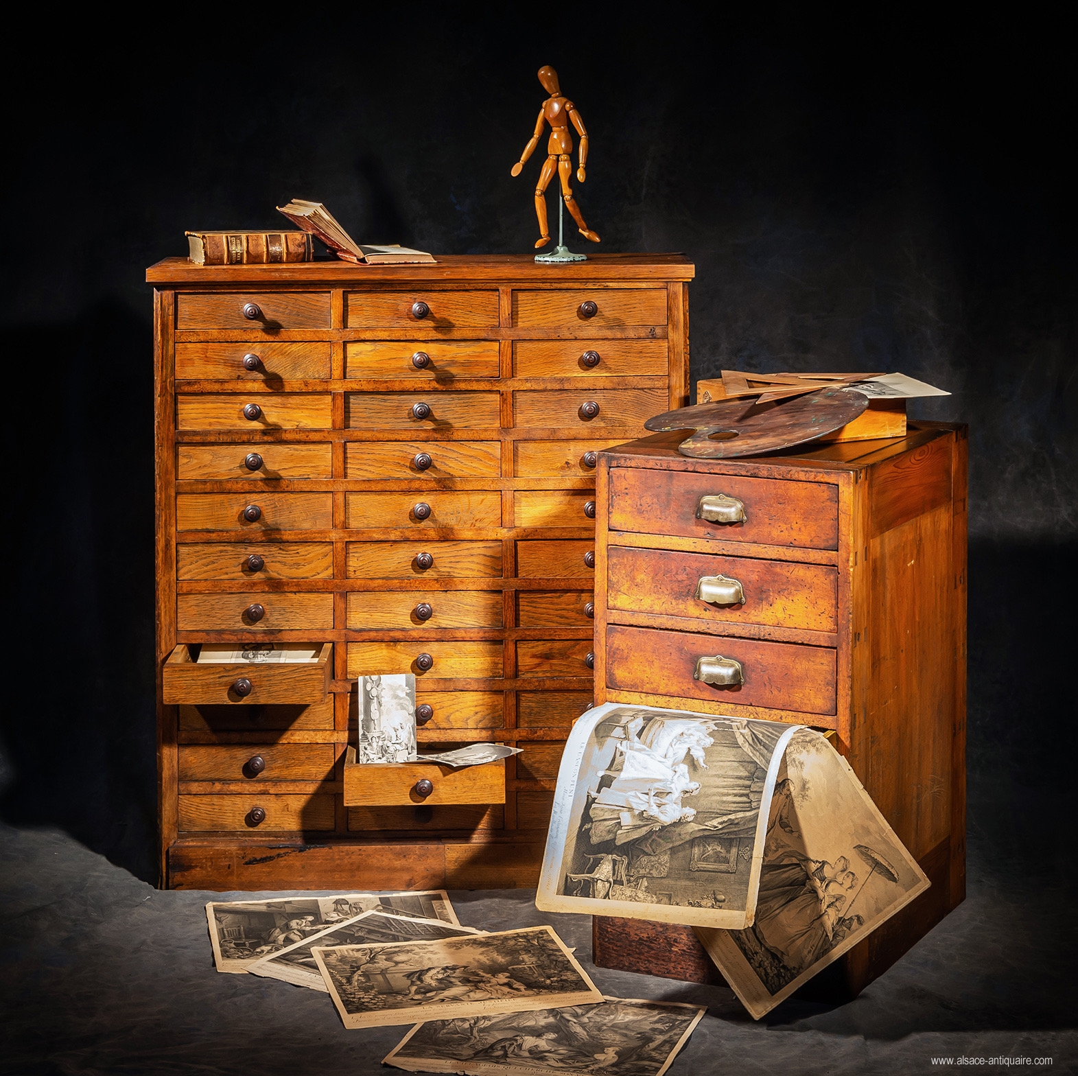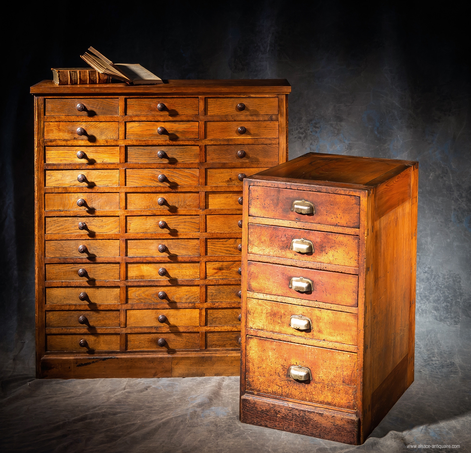 Designed as store or workshop furniture to store stocks of parts, specific tools, notes on know-how, working methods, rare materials, these filing cabinets with drawers, diverted from their initial use, will end up by accommodating collections of minerals, fossils, statuettes, various coins, postcards, bulk stamps, buttons, belt buckles, cigar rings, wine labels, promotional items, pins… the list is endless.
