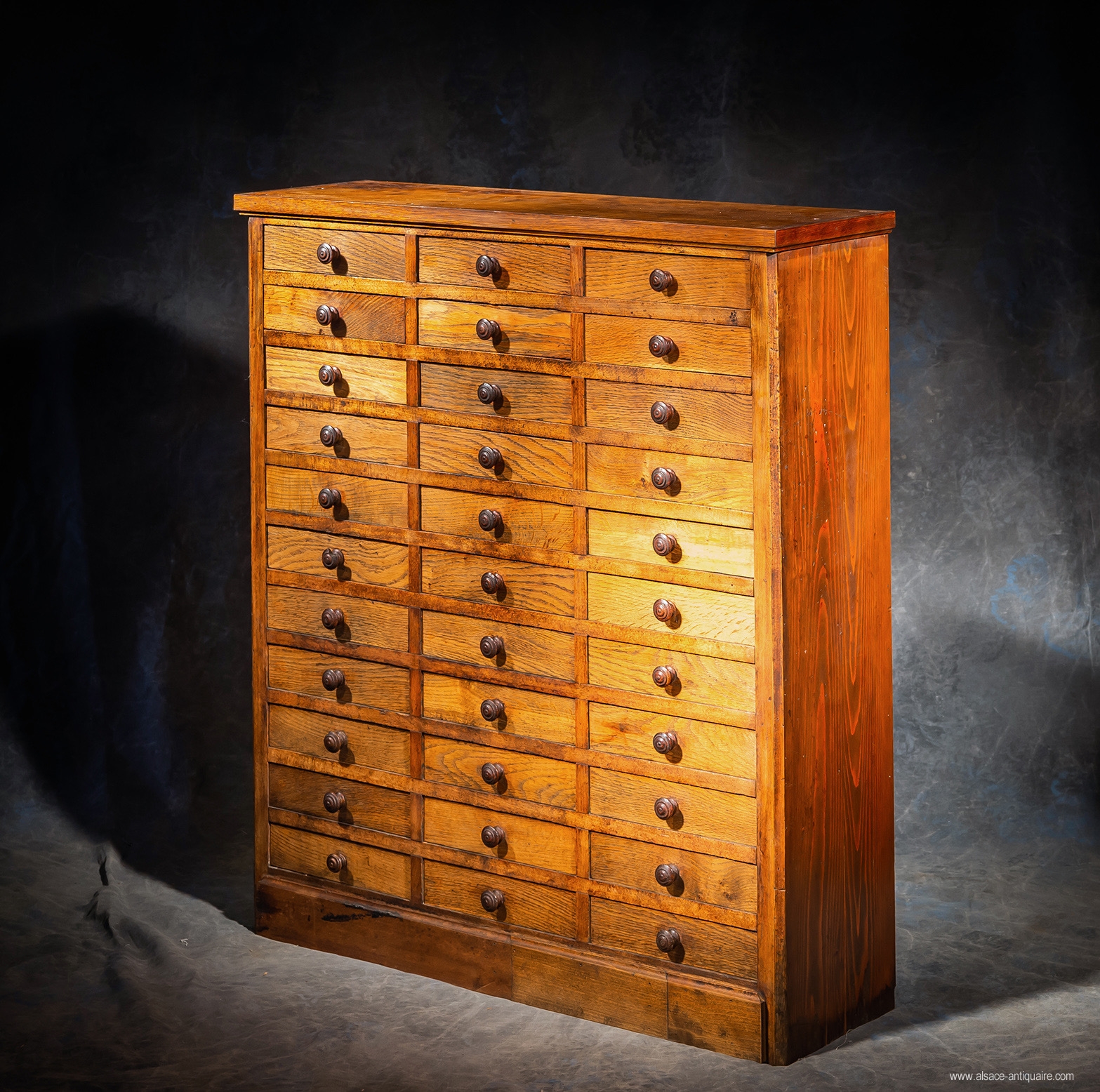 Old store, trade or workshop furniture with many drawers, a collection to discover of late 19th and 20th century furniture, functional, in solid wood, oak or fir, rare and beautiful patina due to intensive use, many models old ones in stock, contact us.