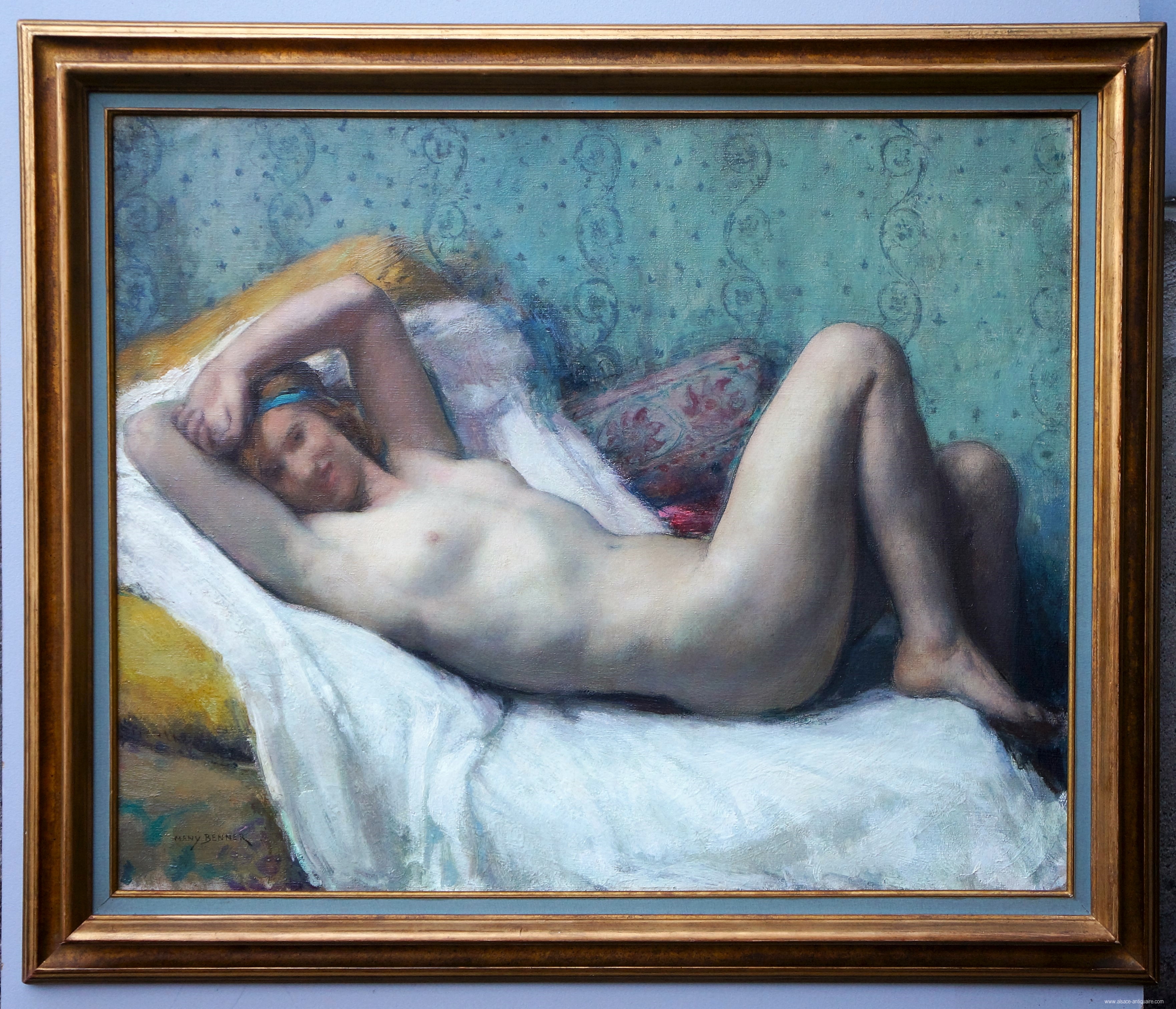 Intimate setting and particularly neat background with the wall covering, with curvilinear patterns in shades of celadon green, the different areas of color, of the body, of the room and of the textiles that dress the bed, create in this work a soft atmosphere that borders on abstraction. Many Benner excelled in these nudes that made him famous. It was probably the advice of Jean Jacques Henner, an internationally recognized artist and friend of the Benner family, that enabled Many Benner to master renderings of skin tones with such realism but often treated in an intimate setting. These atmospheres with soft lights were magnified by the presence of fabrics whose rendering of material and color was particularly neat. Oil on canvas signed Many Benner. Golden wood frame.