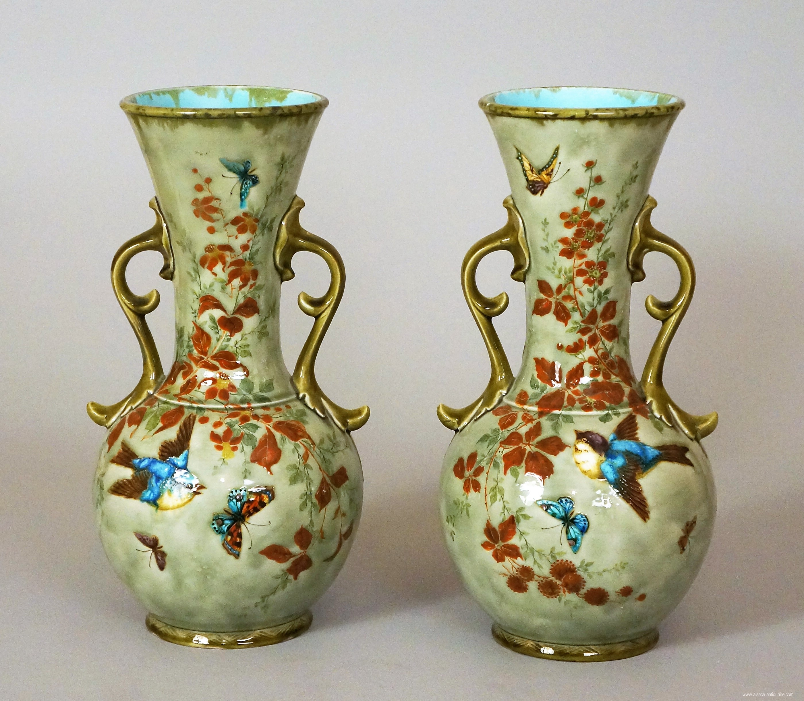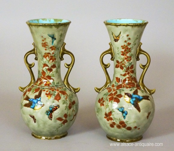 Exceptional decoration of flowers and branches of birds and butterflies for this pair of ceramic vases signed Th. Deck with circular base and fine openwork handles. Théodore Deck Paris workshop Period late 19th century.