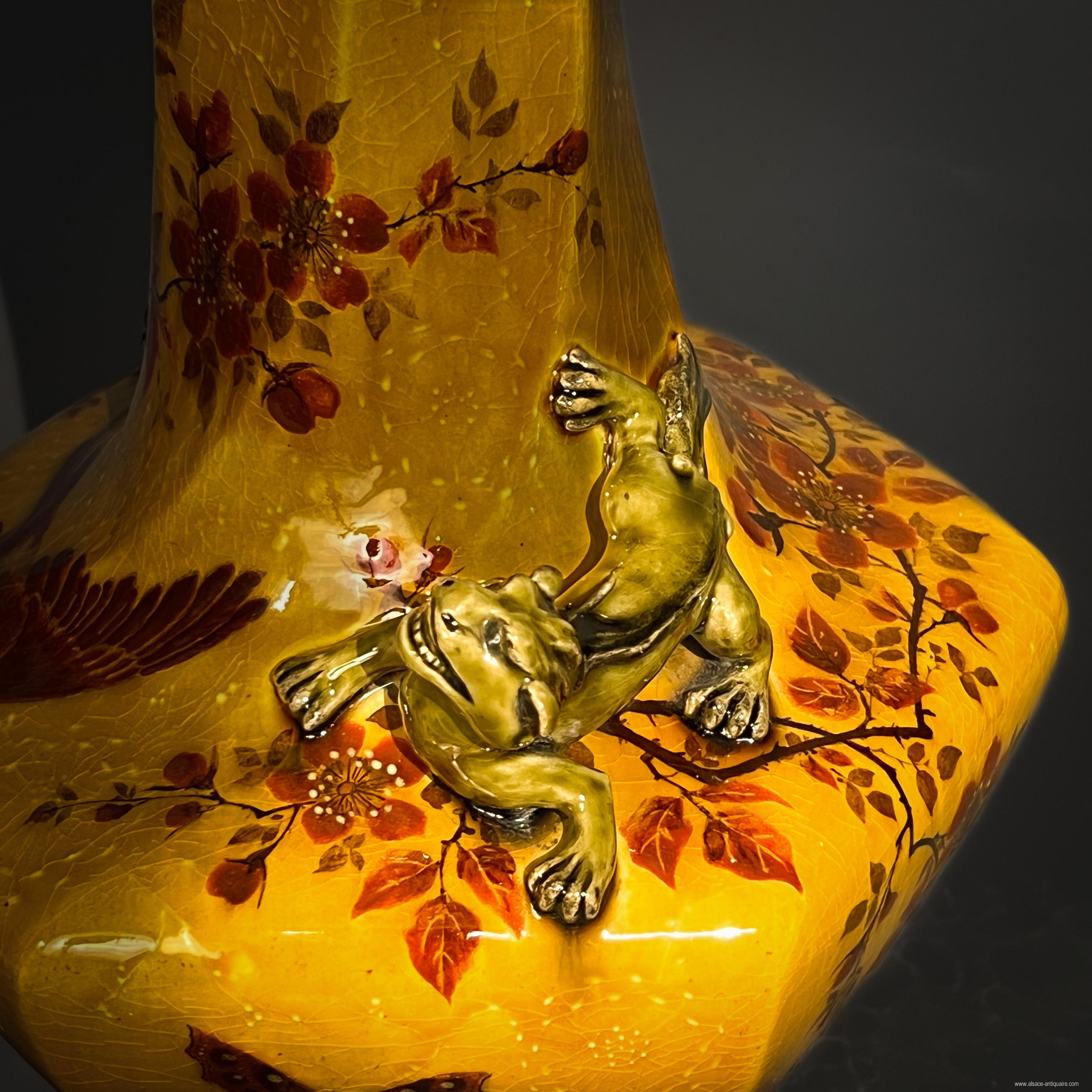Rare pair of ceramic vases with twisted belly in hexagonal shape, dragons as handles, Japanese decoration of birds and butterflies on a gold niello background dotted with flowering branches. Signed under the Th.Deck base + stamp with the effigy of the ceramist.