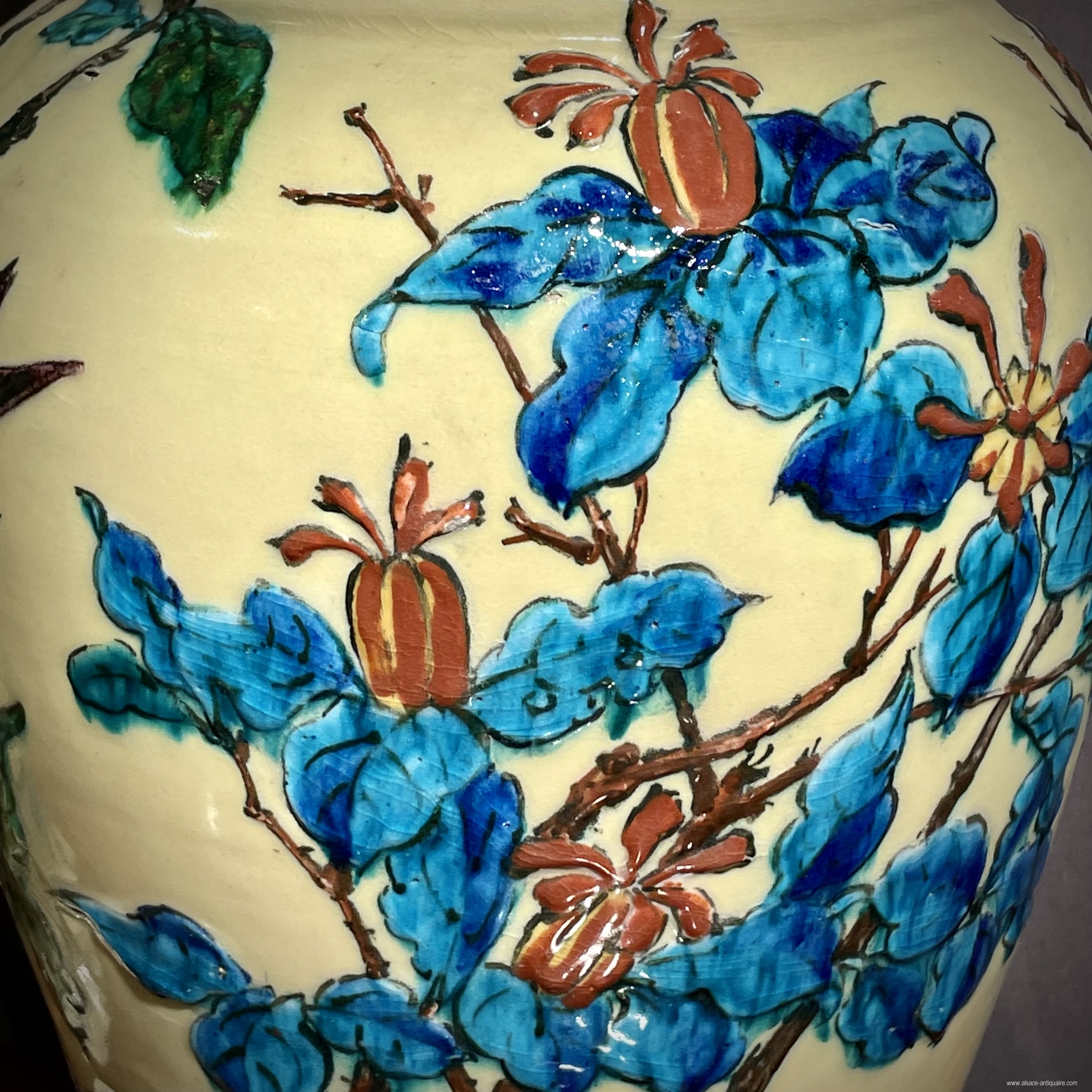 Exceptional large vases forming a pair, Japanese decor in shimmering colors, a rare yellow background on which birds, butterflies, bees and flowering branches evolve. Signed under the base TH. DECK . Théodore Deck (1823-1891), world famous ceramist, was born in Alsace in Guebwiller. Based in Paris, he developed with his brother a ceramics workshop quickly recognized for its productions bringing together technical and artistic quality, he will obtain numerous awards during his participation in major exhibitions in the last third of the 19th century.