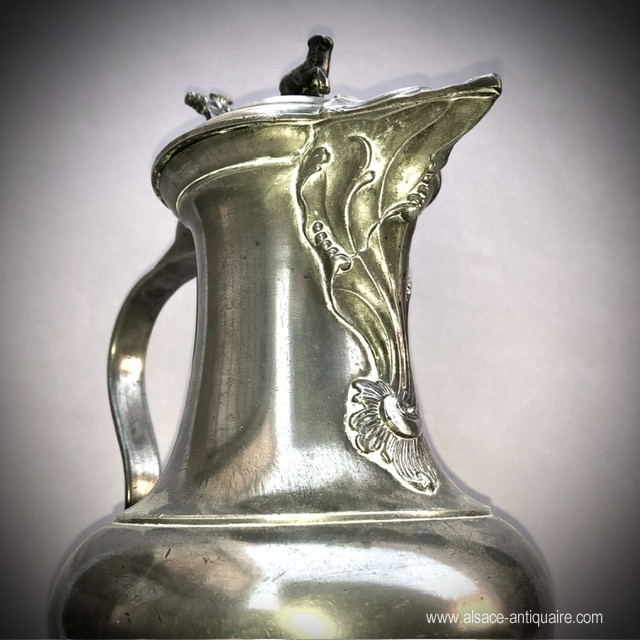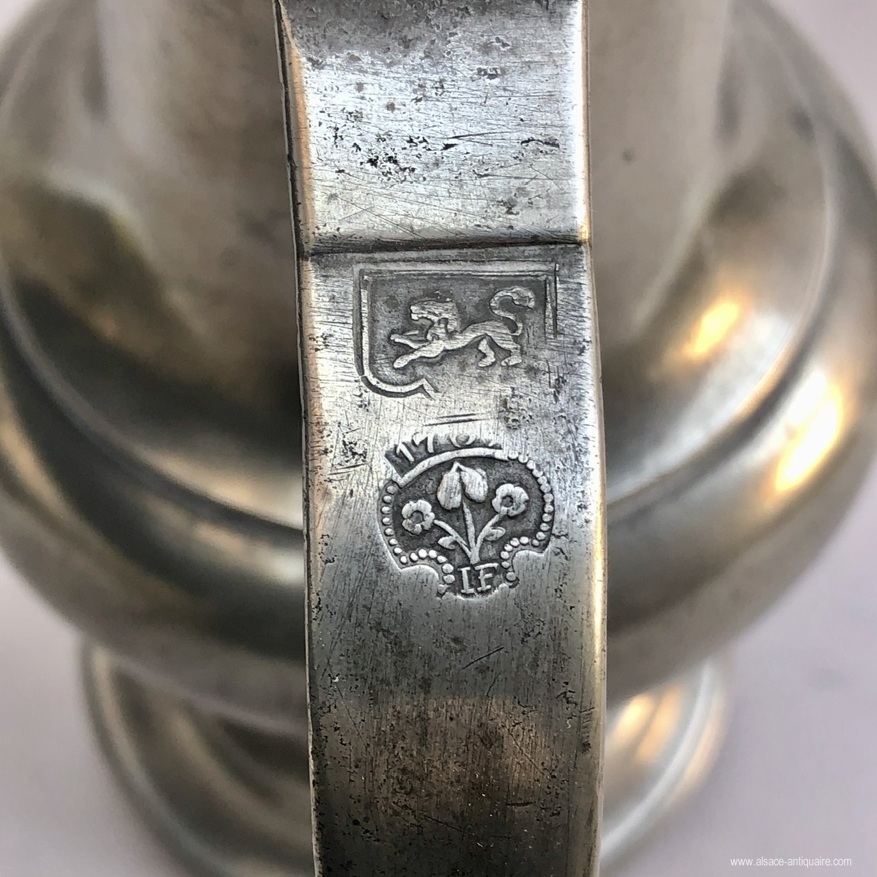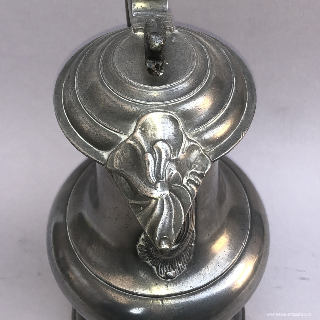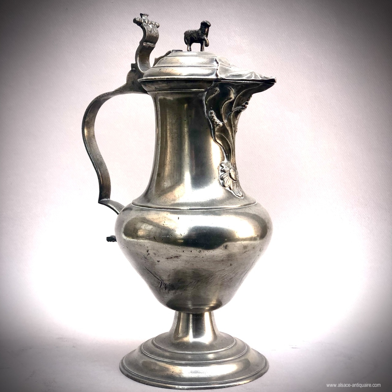 Large and rare pitcher or jug, pewter in the shape of a baluster on a pedestal, the lid has a sheep as a grip, the thumb is gadrooned and embellished with a shell, a decoration of shells and scrolls adorns the console under the spout . Handle with potter's punches. Very nice patina.