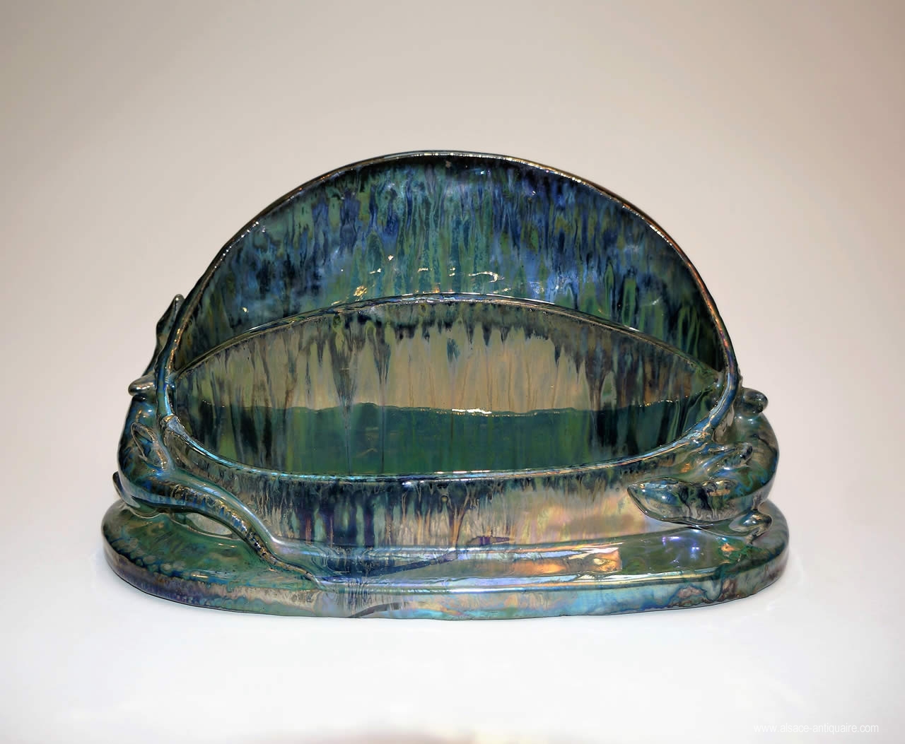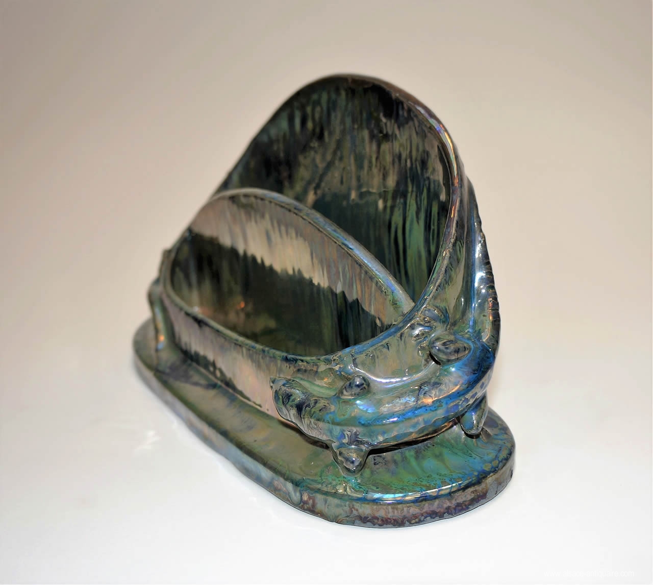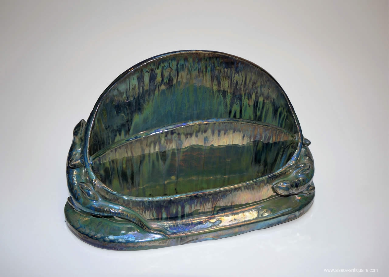 Letters holder Sandstone Rambervilliers, beautiful iridescent green color with bluish reflections, two lizards based on each side of the central body. Signatures under the base: buffer "Grès de Rambervilliers France" and "Unis France" and signature "A. Schneider"