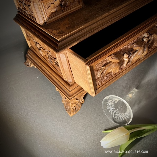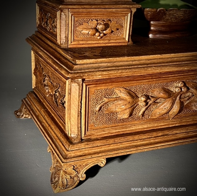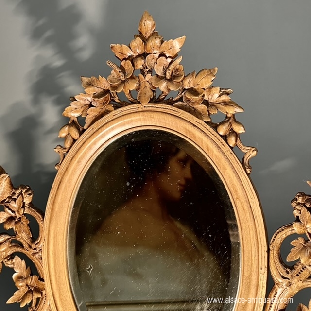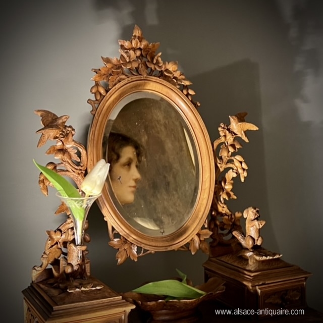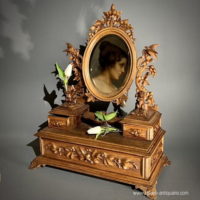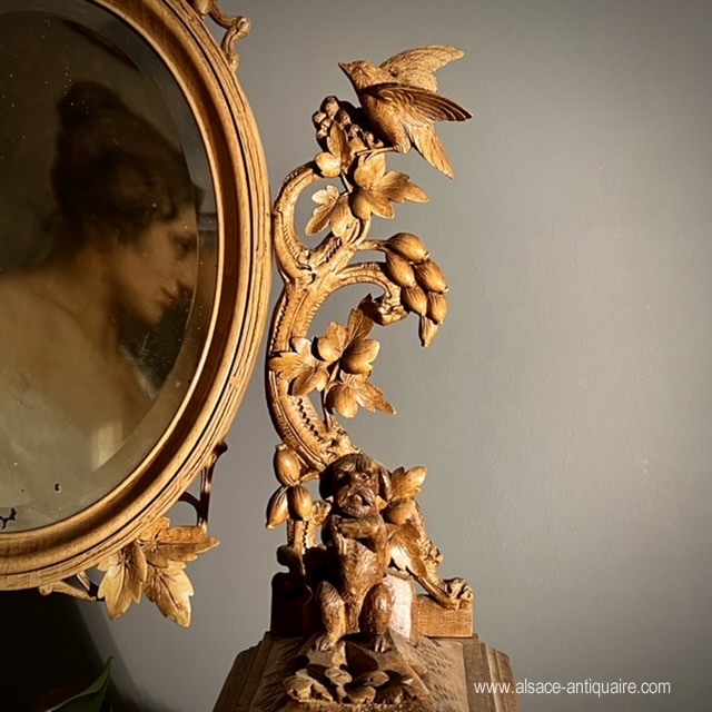 Original in design, this rare psyche has three drawers, the mirror is bevelled, set in an oval wooden frame, and can tilt. The mirror fixing consoles are carved with openwork branches, at the top of which sits a baby bird. A couple of marmots throne on either side of the mirror, standing on a pile of rocks, they each hold in their paws, a small blown glass vase engraved with a leafy frieze. The drawers are carved with a decoration of mountain flora. The top that overlooks the large drawer has a sandblasted bottom, engraved with small patterns. Note the incredible finesse of the sculptures and the attention to detail given by the craftsman to the realization of this piece. Folk art work from the Swiss Alps region of Brienz Period late 19th century early 20th century.