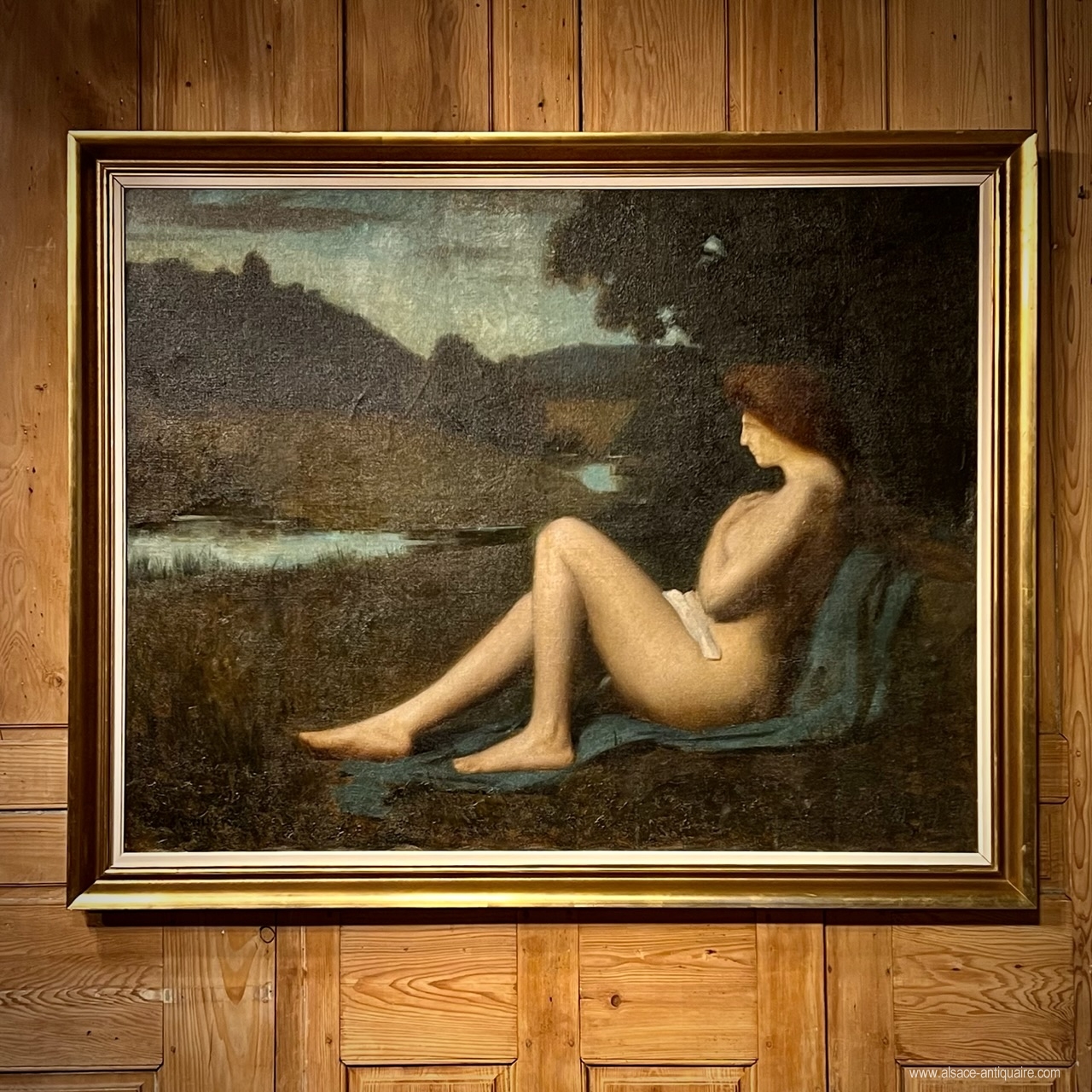 Treated in the spirit of the works of Jean Jacques Henner, of whom Zwiller was an unconditional admirer, this beautiful oil on canvas of a large format, integrates as a background, a landscape of Sundgau, ideal with these contrasts provided by the dark of the forests and the pale blue reflections of the sky in the ponds. The objective of the artist's work is the rendering of light on the different tones of the flesh in addition to the feelings of tranquility released by this evening atmosphere. Signed lower left A.Zwiller.