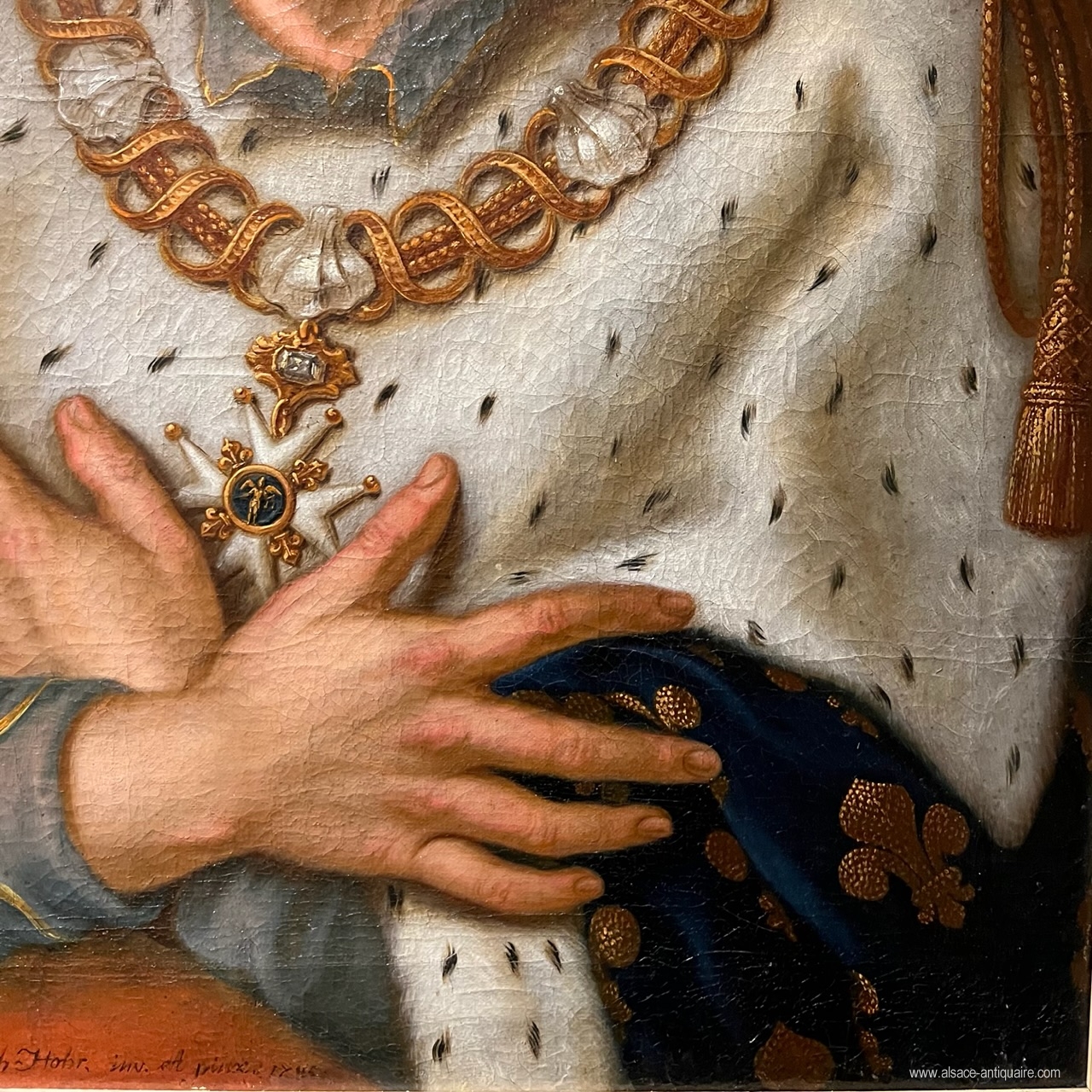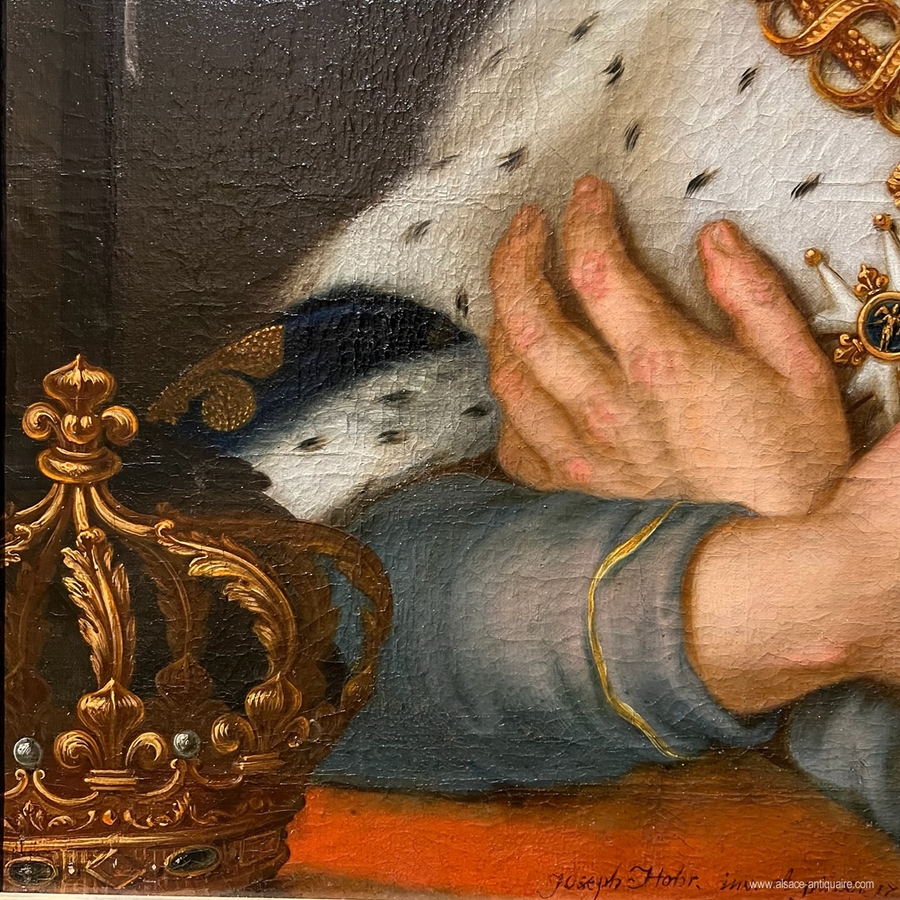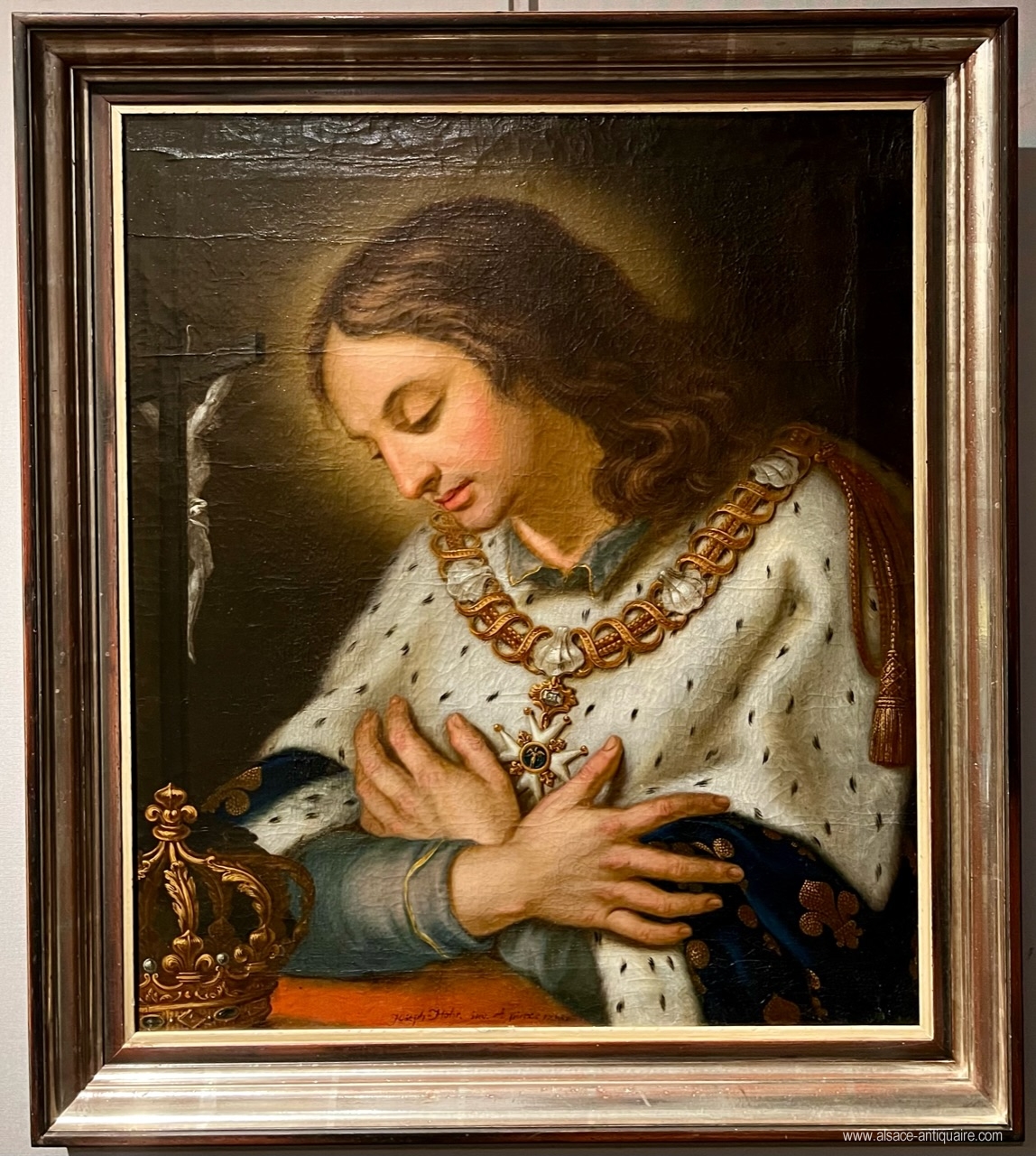 Tribute to King Louis IX, the only one of the French kings canonized, under the name of Saint-Louis, he is represented here next to his crown. Work signed by Joseph-François Hohr, one of the members of the dynasty of artists who established their studio in Colmar in the 18th century. The Unterlinden Museum has evidence of their work in its collections. This portrait of Saint Louis is signed at the bottom right and dated: Joseph FHohr inv pinx 1786. Joseph Hohr is renowned for his miniatures, his mastery is confirmed here by an acute sense of detail. 18th century period. Modern wood and white gold frame.