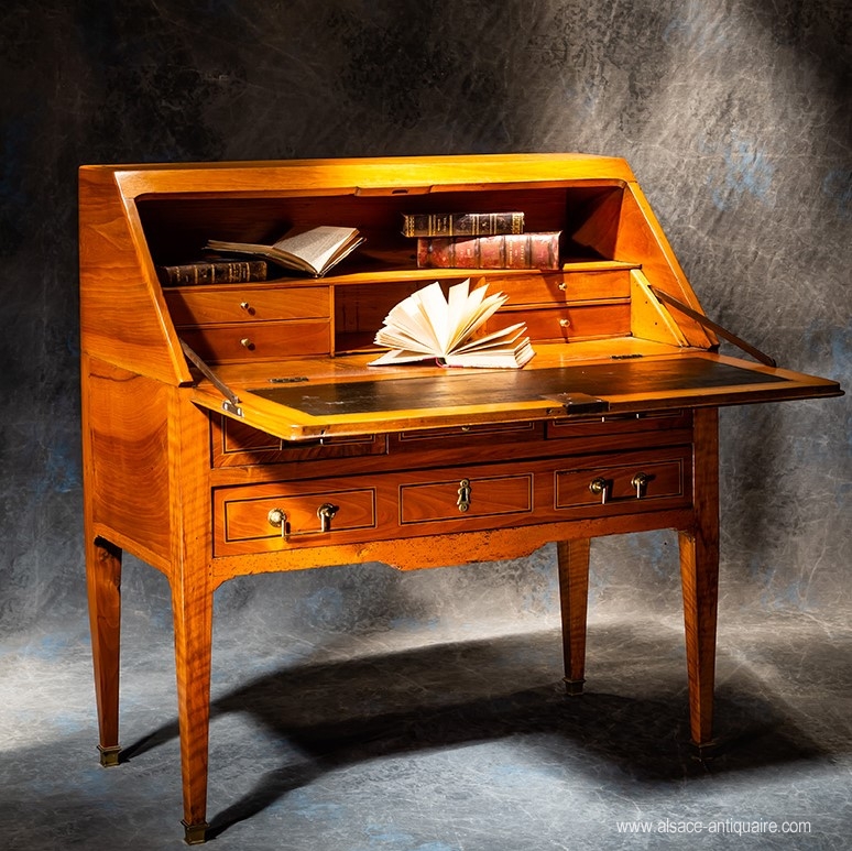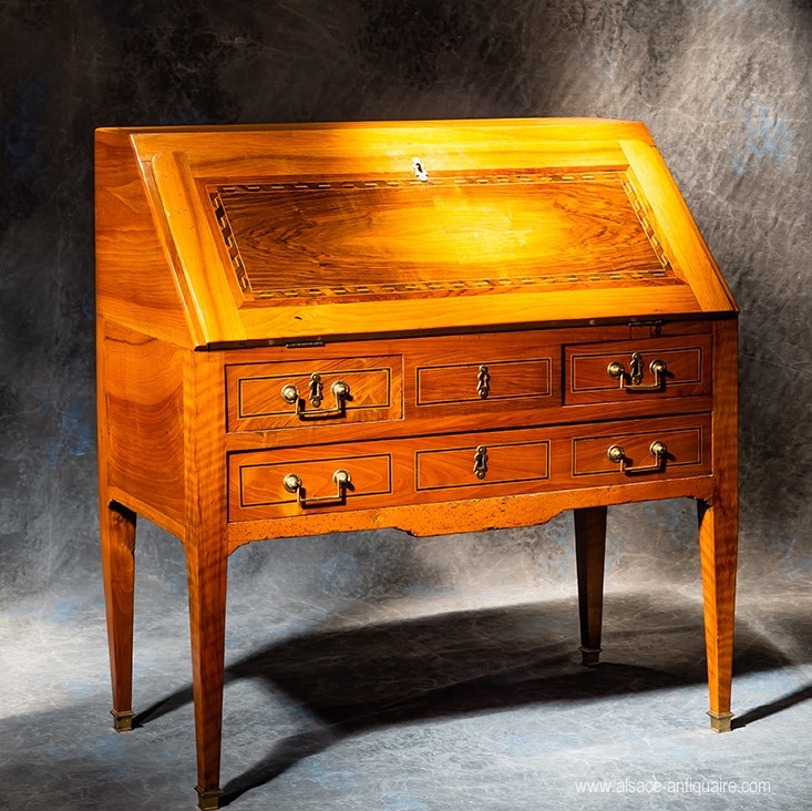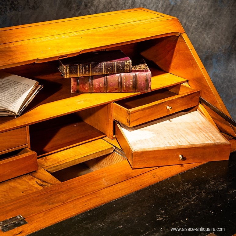 Sober and dressed in a beautiful blonde patina, this secretary with very roomy dimensions will find its place in any type of interior. Walnut and maple inlay. Alsace - Period early XIX th.
