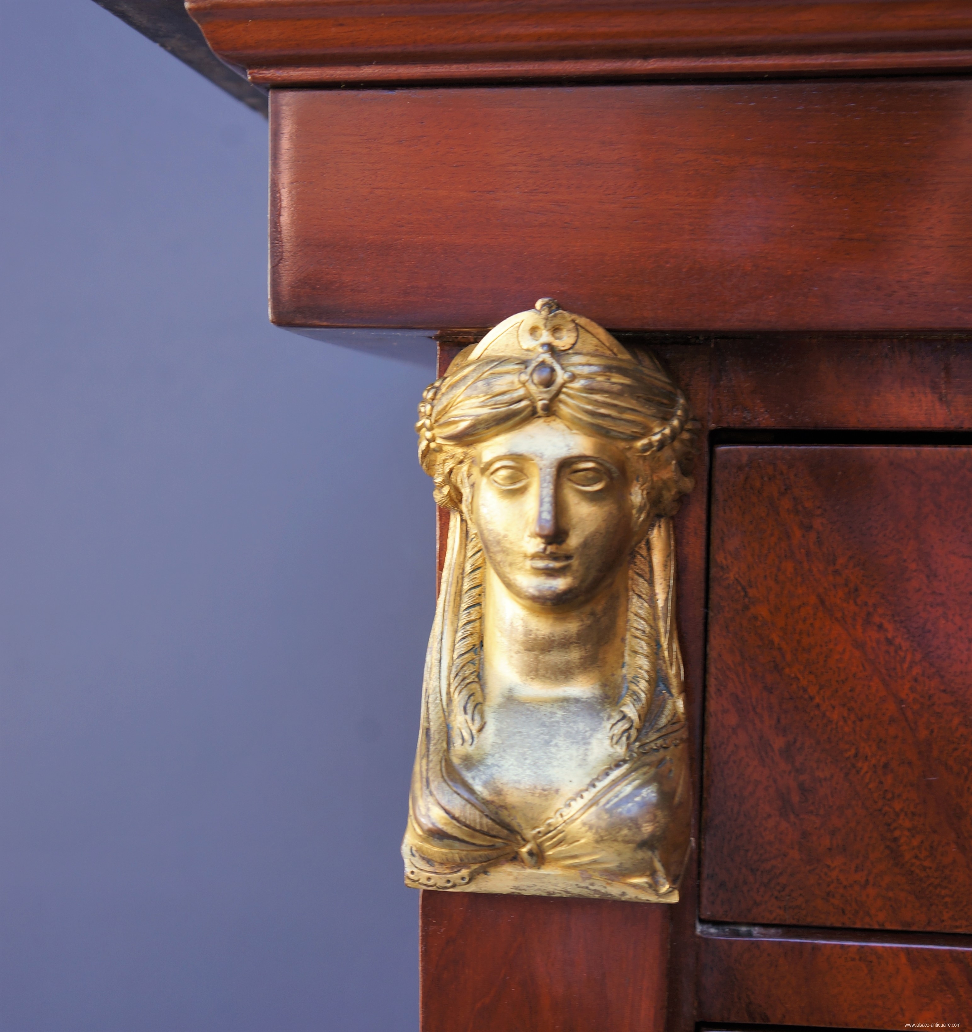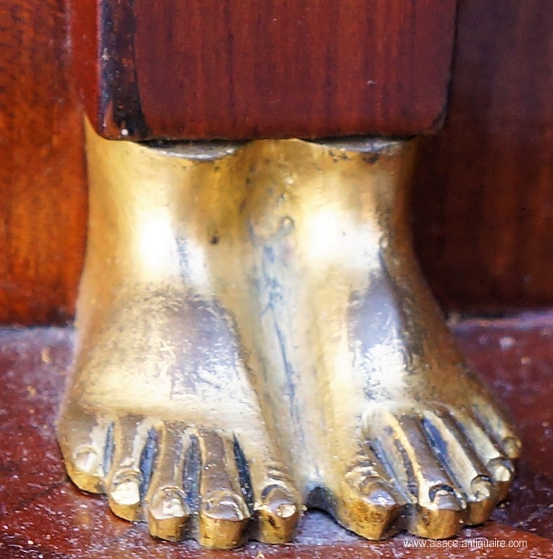 Empire " Back from Egypt " style writing desk, covered with flammed mahagony. Gained columns are adorned with an Egytpian woman bust in bronze. The internal side is covered with embossed leather, with three arcades rounding a set of drawers. The front side is hiding a big drawer with grey/black marble. Beginning of the XIXth century.