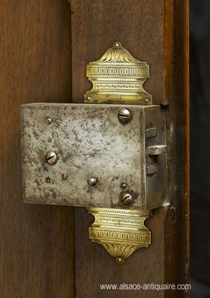 This lock is from the outstanding two-part buffet, curved on 3 sides. The eaves are in gendarm’s hat style, finely sculpted with laurel foliage and scrollwork, typical Alsatian decoration. The bottom of the wardrobe is floored with oak wood as curved wardrobes, Strasbourg masterpieces during the XVIIIth century, in walnut wood.