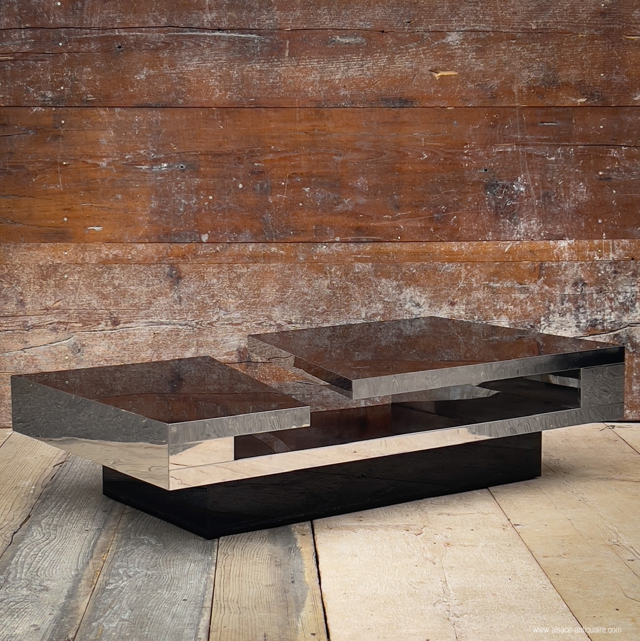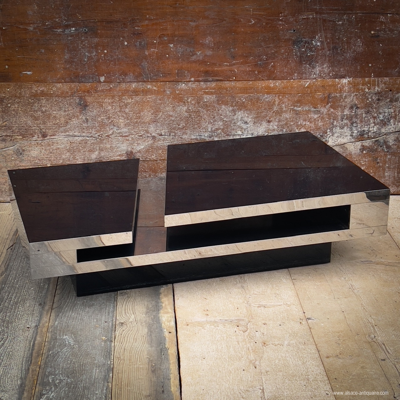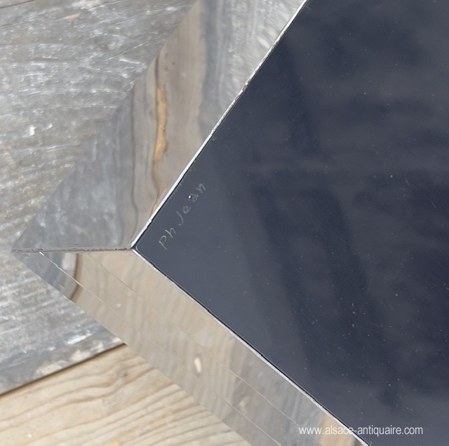 Probably one of the most beautiful creations in furniture by Philippe Jean (1931-1987), this coffee table, very structured with its diagonal break and the cantilever displayed by each tray, is a model of balance and radicality. Its design uses thin stainless steel sheets and lacquered Plexiglas panels from below. It is signed P. JEAN on the corner of one of the trays. Creation of the 1970s. Good condition, with some scratches and abrasions.