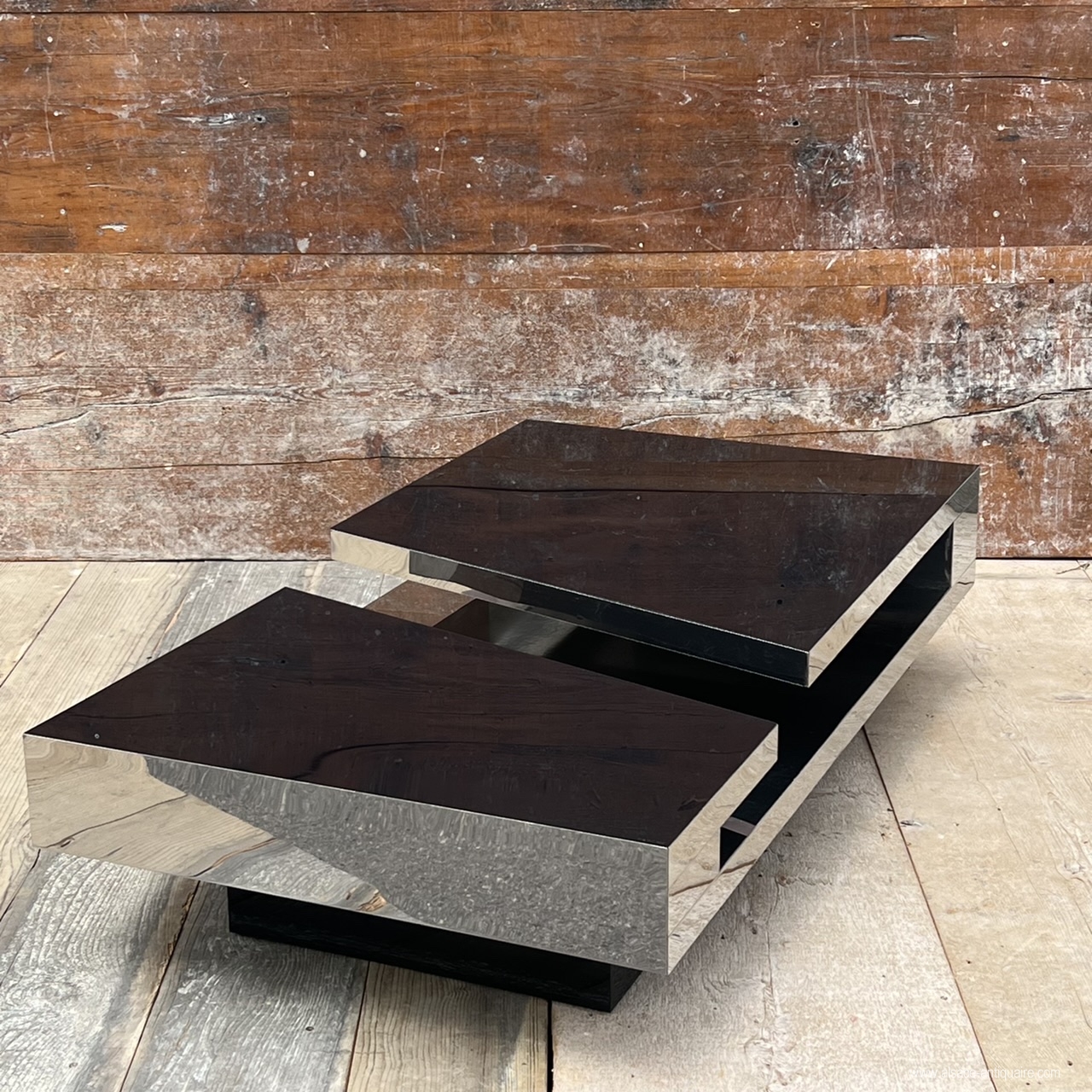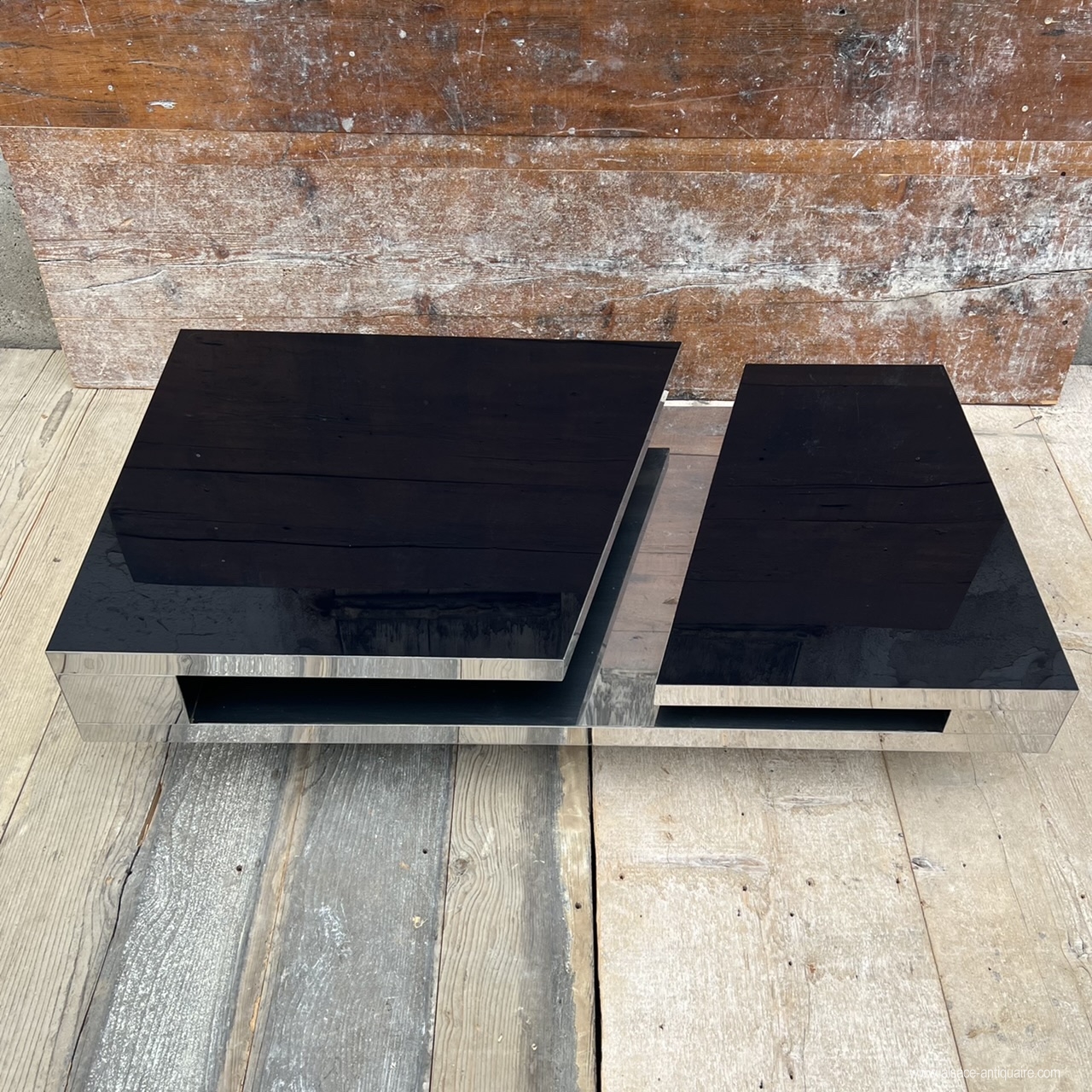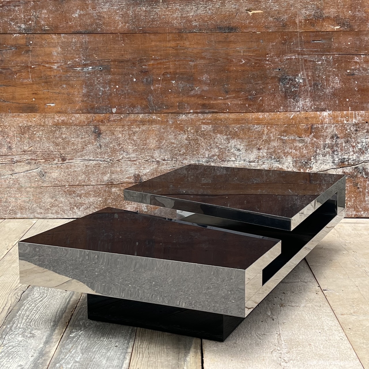 Probably one of the most beautiful creations in furniture by Philippe Jean (1931-1987), this coffee table, very structured with its diagonal break and the cantilever displayed by each tray, is a model of balance and radicality. Its design uses thin stainless steel sheets and lacquered Plexiglas panels from below. It is signed P. JEAN on the corner of one of the trays. Creation of the 1970s. Good condition, with some scratches and abrasions.