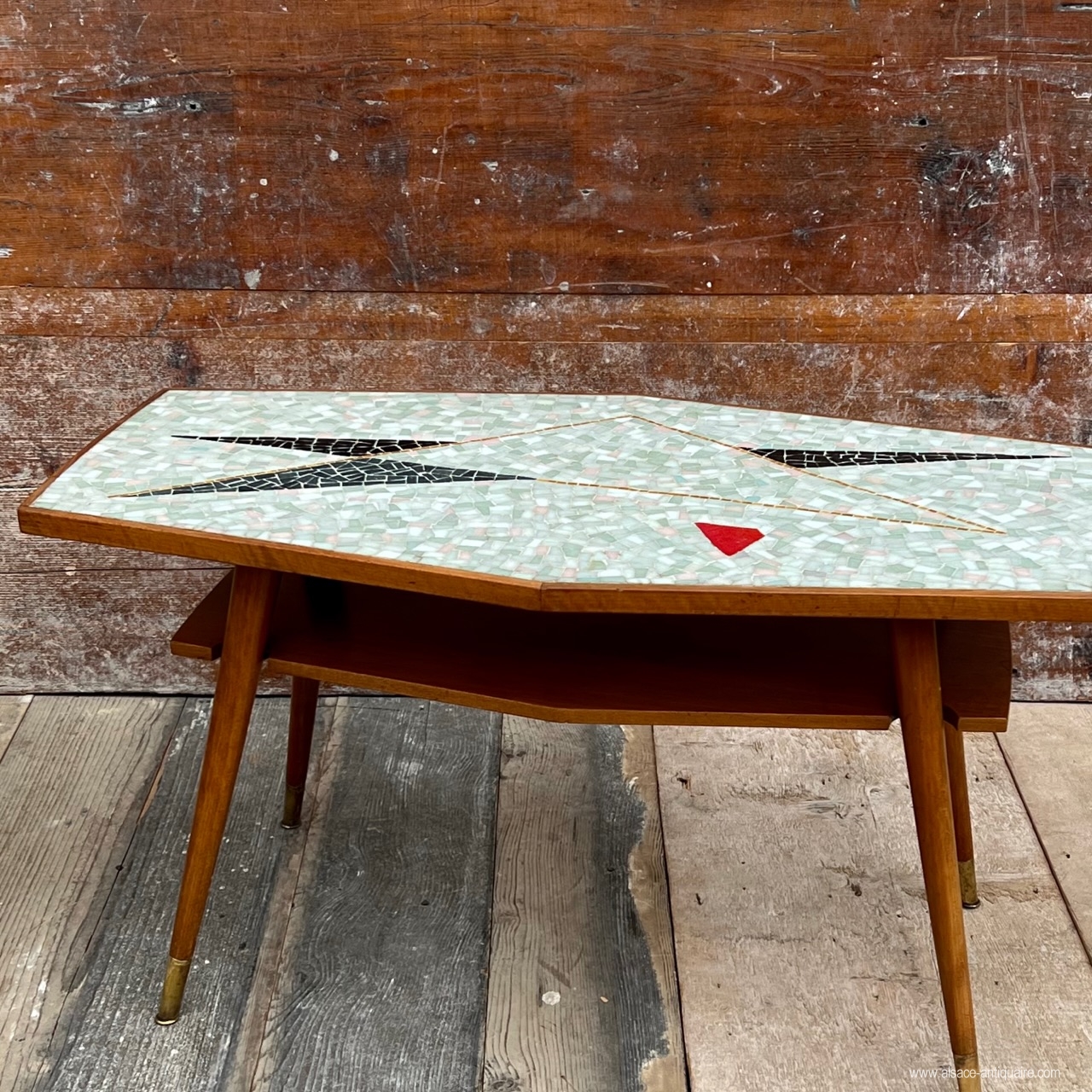 Beautiful trapezoidal shape for this table top decorated with an abstract painting in ceramic mosaic. The perimeter of the top is surrounded by a natural oak molding, a second top connects the 4 conical legs. Very good state.