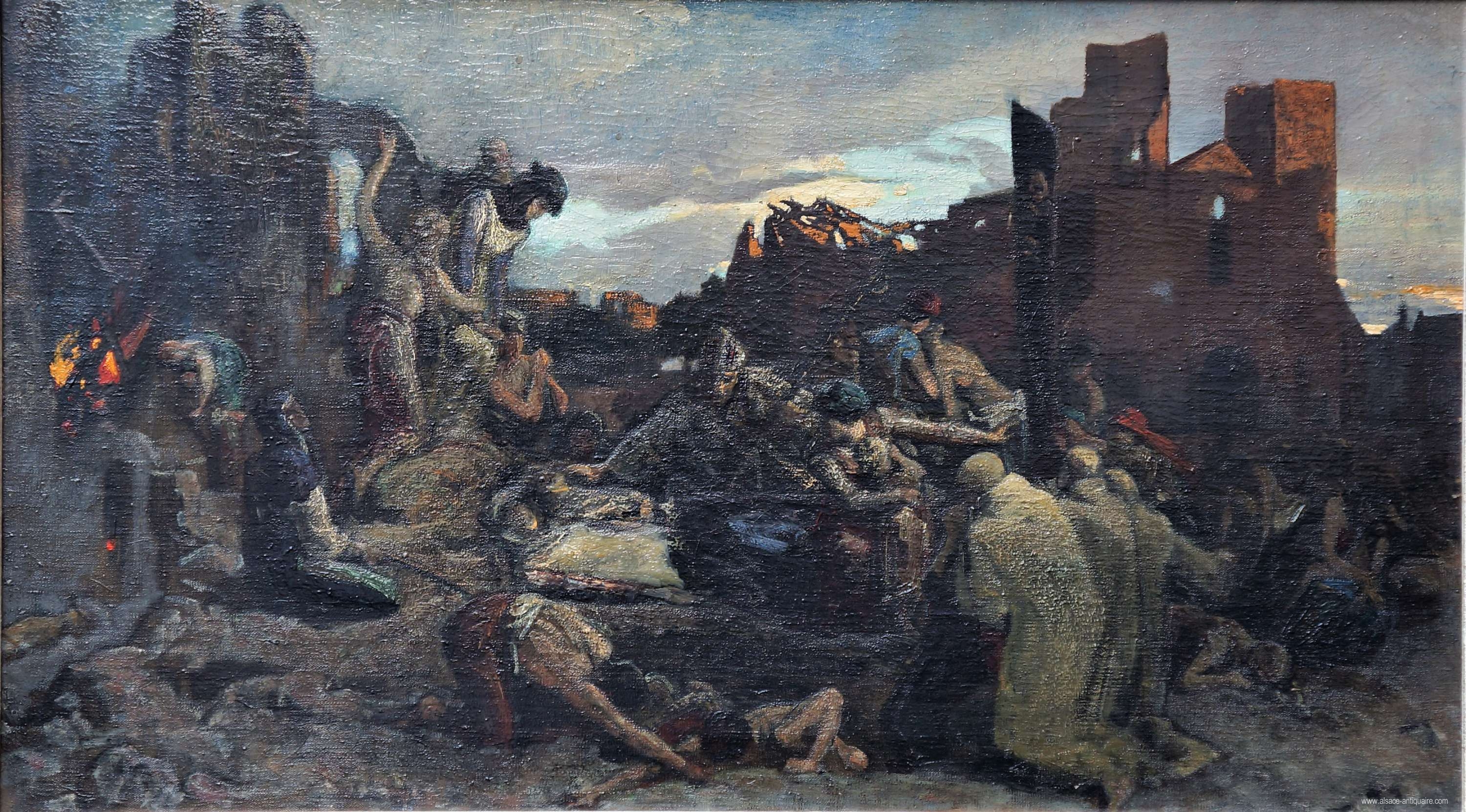 Apocalyptical vision of the spectacular earthquake that happened in Bâle in 1356. Imaginary atmosphere inspired by old sketches, painted by the Swiss artist Ernst Stückelber (1831-1903) in 1883.