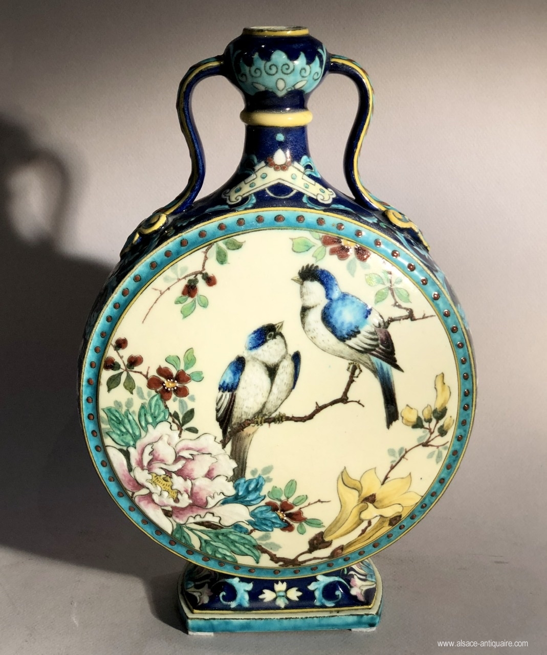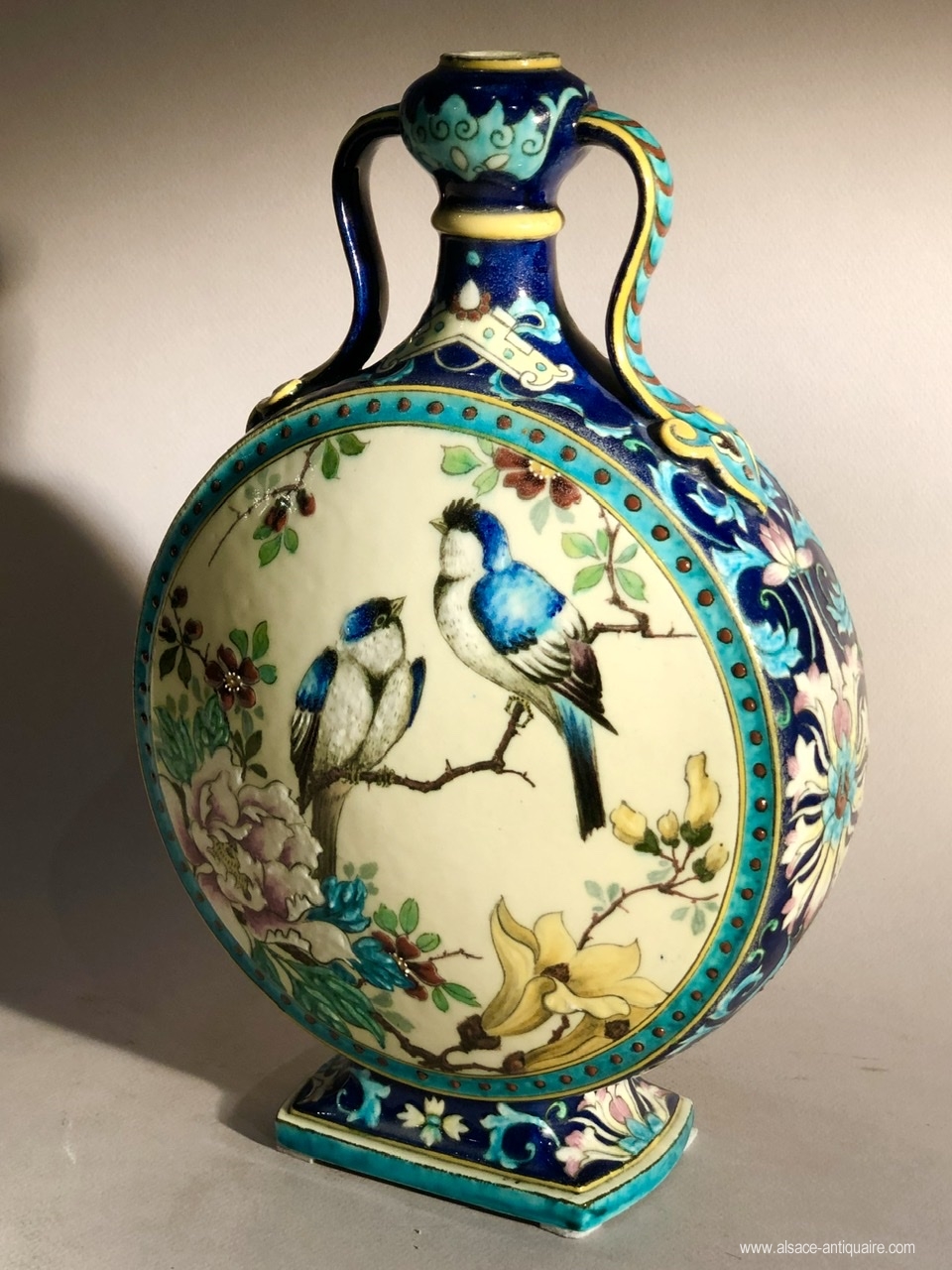 Théodore Deck (1823-1891) Ceramic gourd vase with double-sided decoration of birds and flowering branches on a cream background, blue circular frieze, the sides of the vase are decorated with stylized floral motifs on a midnight blue background. Thin side handles. Signed under the base of the TH brick red stamp. DECK. Period XIX th century.