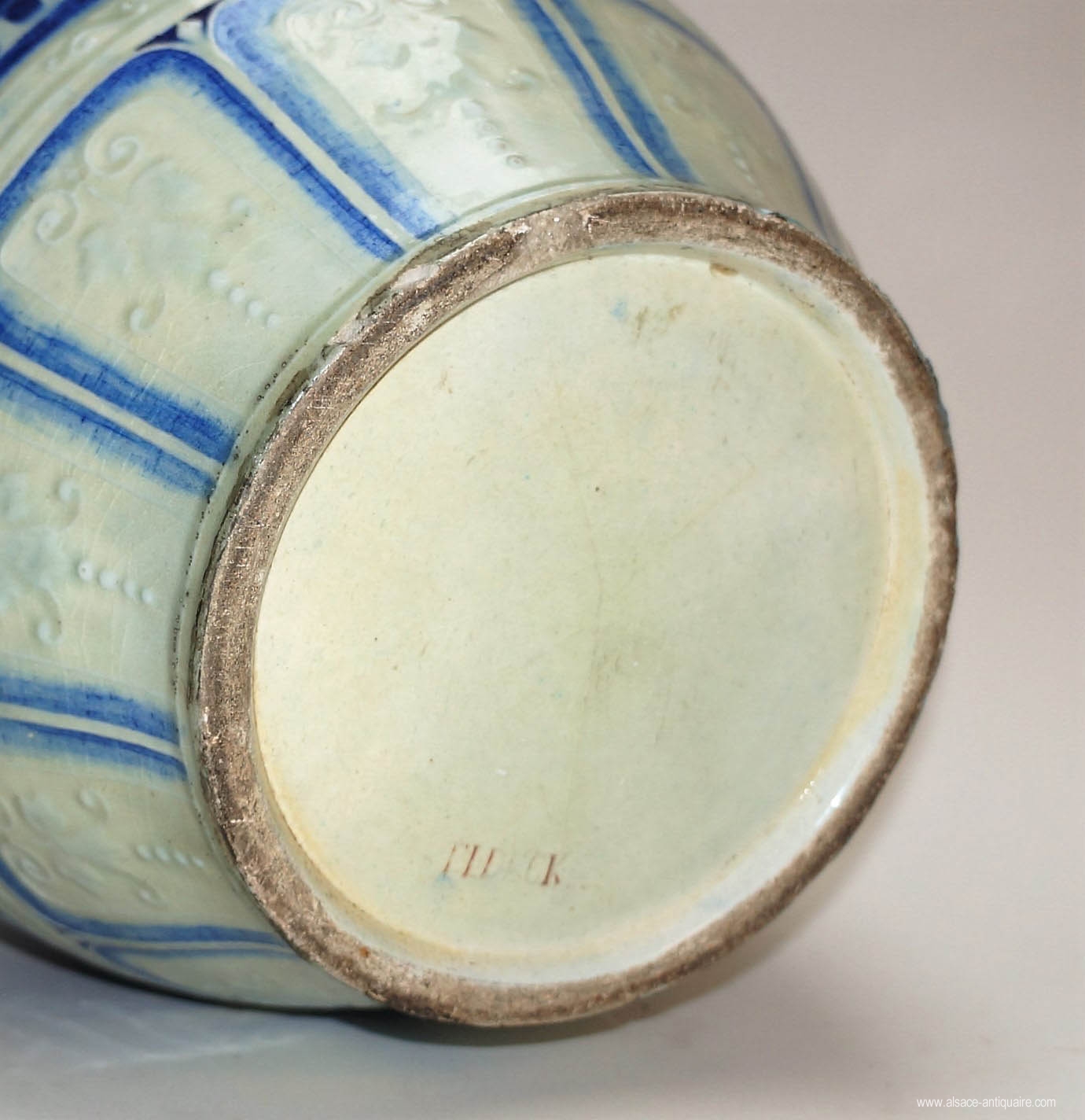 Important ovoid ceramic vase. Decorated with a large frieze of Virginia creepers and high and low friezes with stylized vegetal patterns. Cream white, milk white and blue glaze. Signed “TH. Deck” under the base.