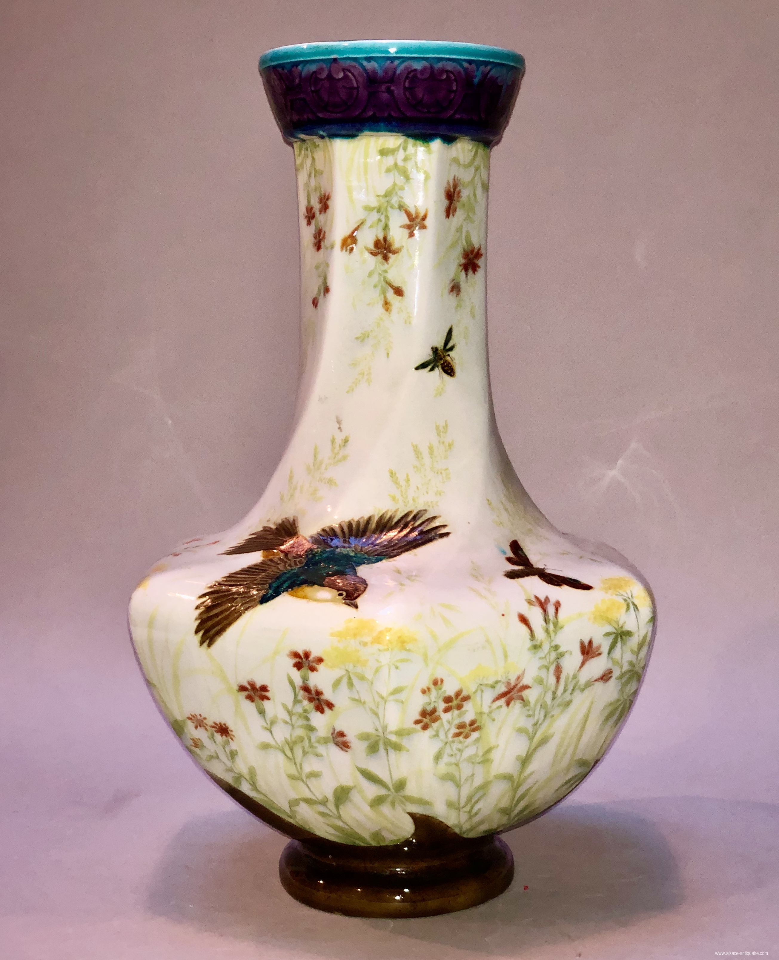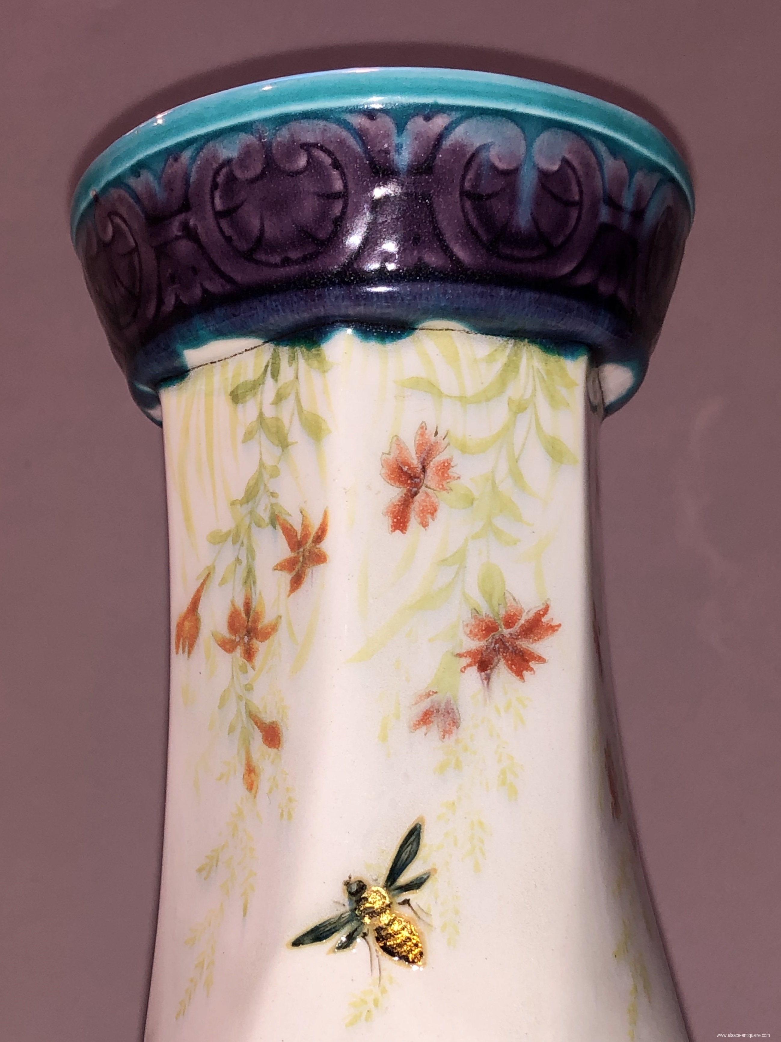 Exceptional hexagonal vase, twisted, with faceted body and circular neck surrounded by an aubergine frieze. Beautiful Japanese decor of birds and butterflies with wings charged with metallic, gold and lapis reflections, twirling on a celadon background decorated with a background of flowering branches. Signed in hollow TH. DECK