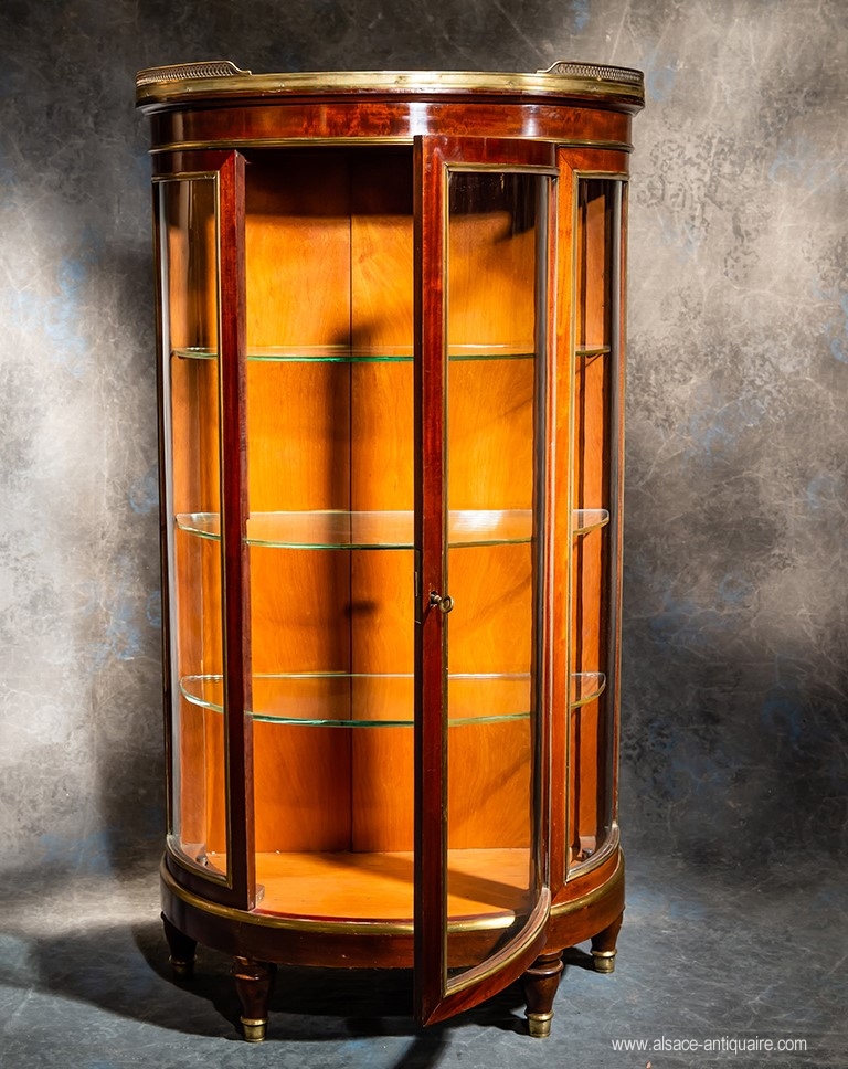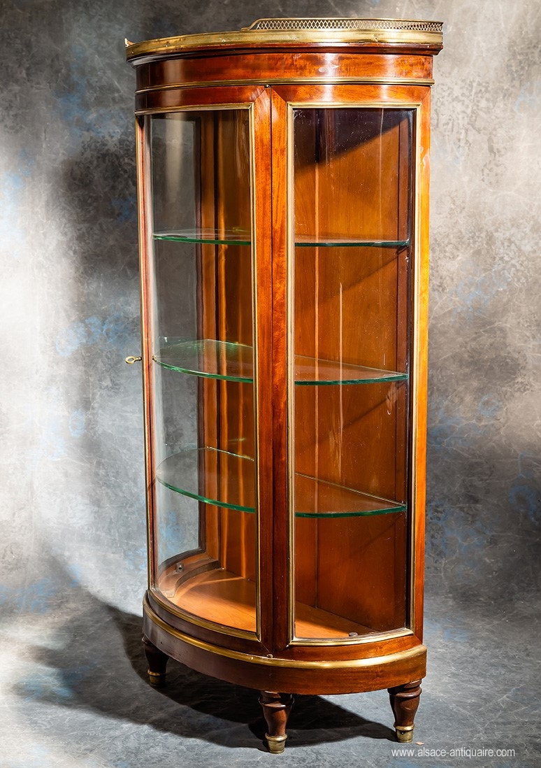 Small showcase with one door Louis XVI - Directoire style, walnut, front with curved glass, sides whose glasses are also curved. moldings surrounded by brass rods, spinning top feet. XIXth century.